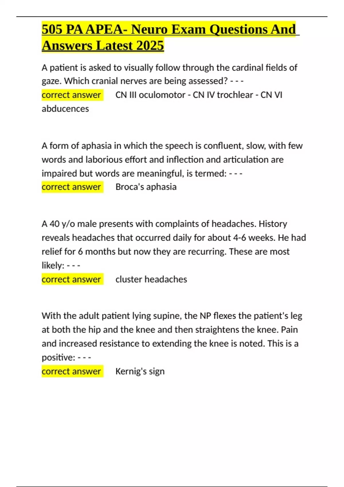 , 505 PA APEA- Neuro Exam Questions And