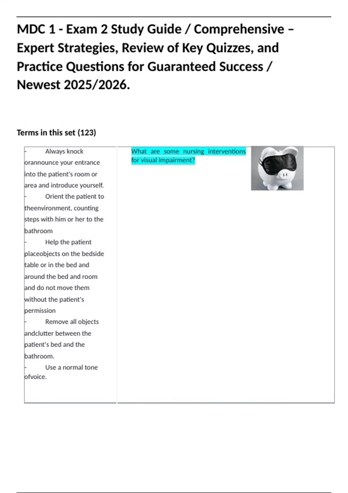 MDC 1 - Exam 2 Study Guide / Comprehensive – Expert Strategies, Review of Key Quizzes, and Practice Questions for Guaranteed Success / Newest 2025/2026. Terms in this set (123) - Always knock orannounce your entrance into the patient's room or area and introduce yourself. - Orient the patient to theenvironment, counting steps with him or her to the bathroom - Help the patient placeobjects on the bedside table or in the bed and around the bed and room and do not move them without the patient's permission - Remove all objects andclutter between the patient's bed and the bathroom. - Use a normal tone ofvoice. What are some nursing interventions for visual impairment? anisocoria a condition in which the pupils are unequal in size exophthalmos protrusion of the eyeballs, as seen in Graves disease enophthalmos sunken eyes, eyeballs are recessed