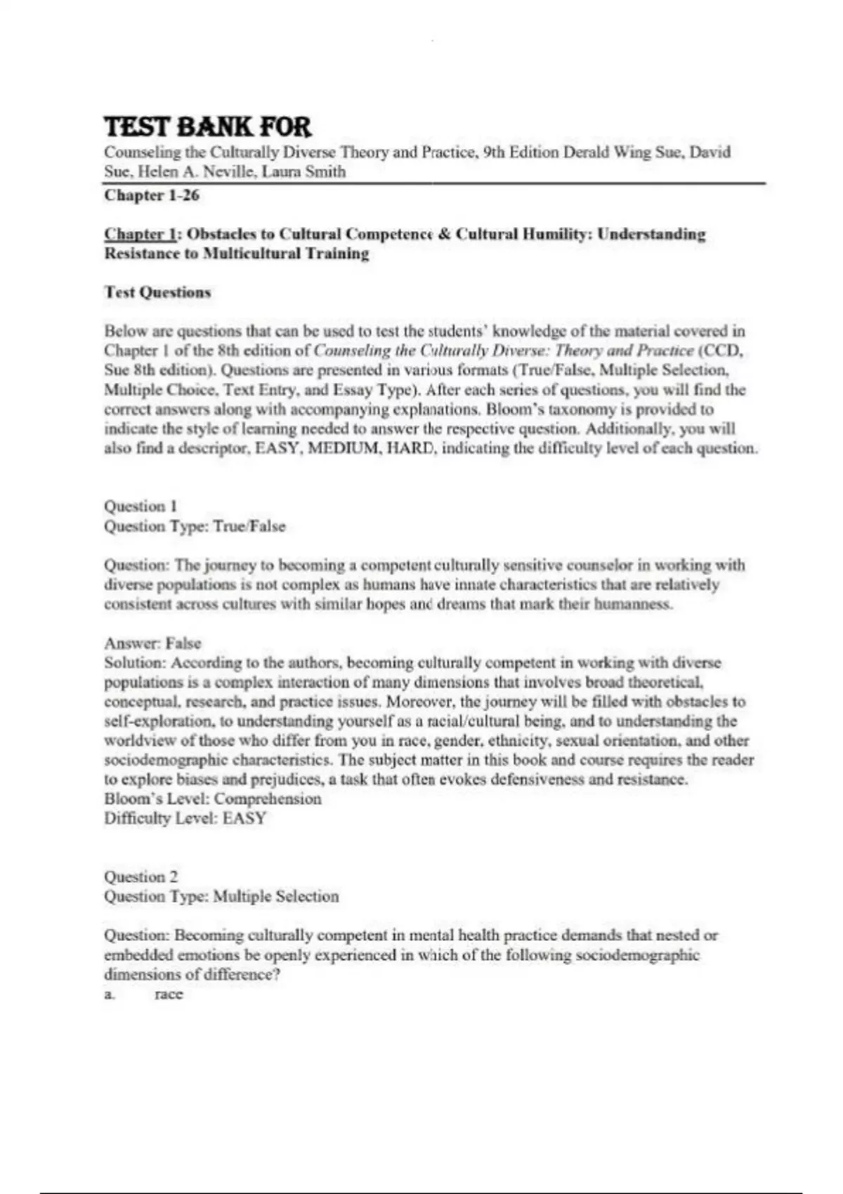 Test Bank For Counseling the Culturally Diverse Theory and Practice, 9th Edition by Derald Wing Sue, David Sue, Helen A. Neville, Laura Smith Chapter 1-26