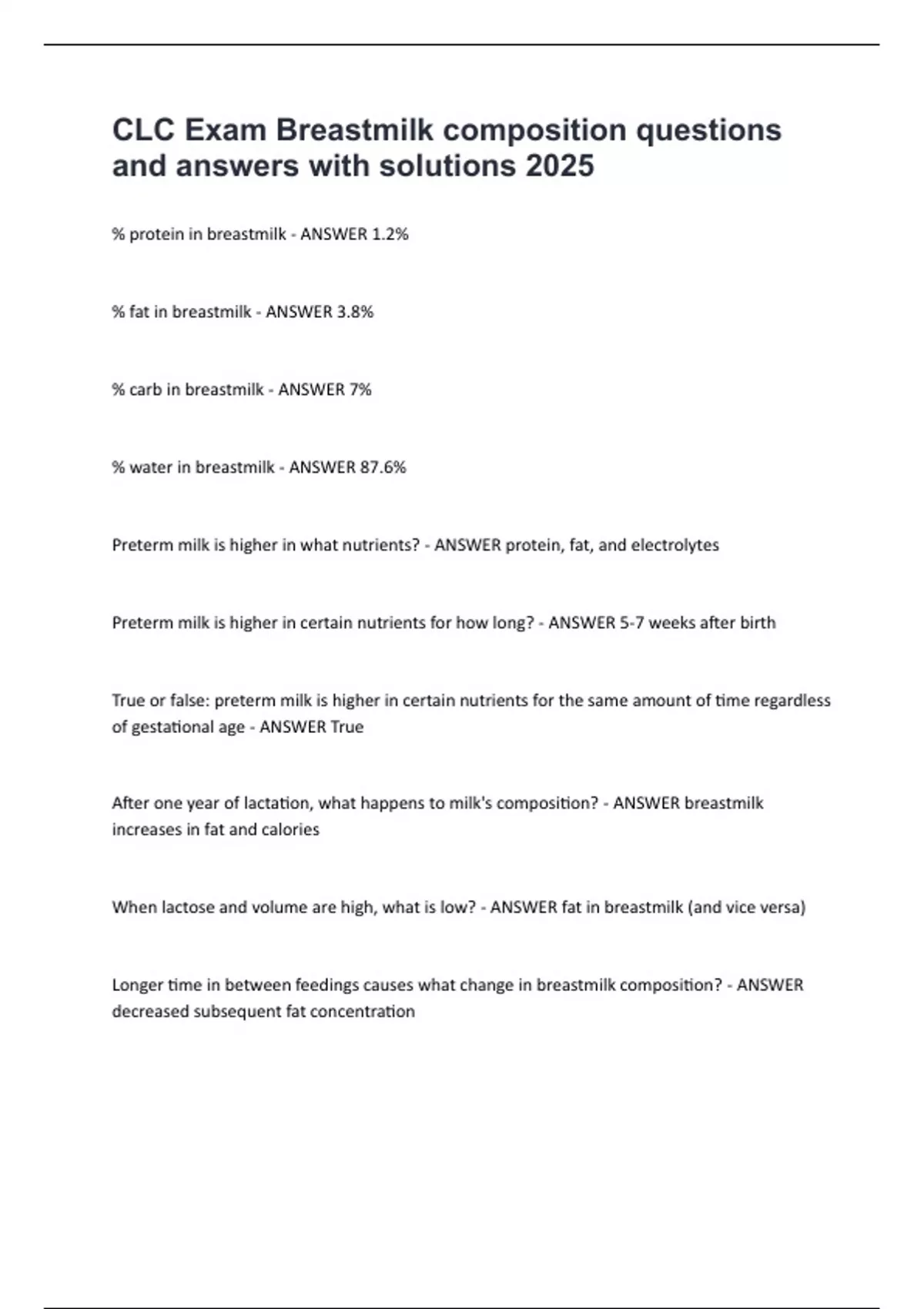 Preterm milk is higher in what nutrients? - ANSWER protein, fat, and electrolytes