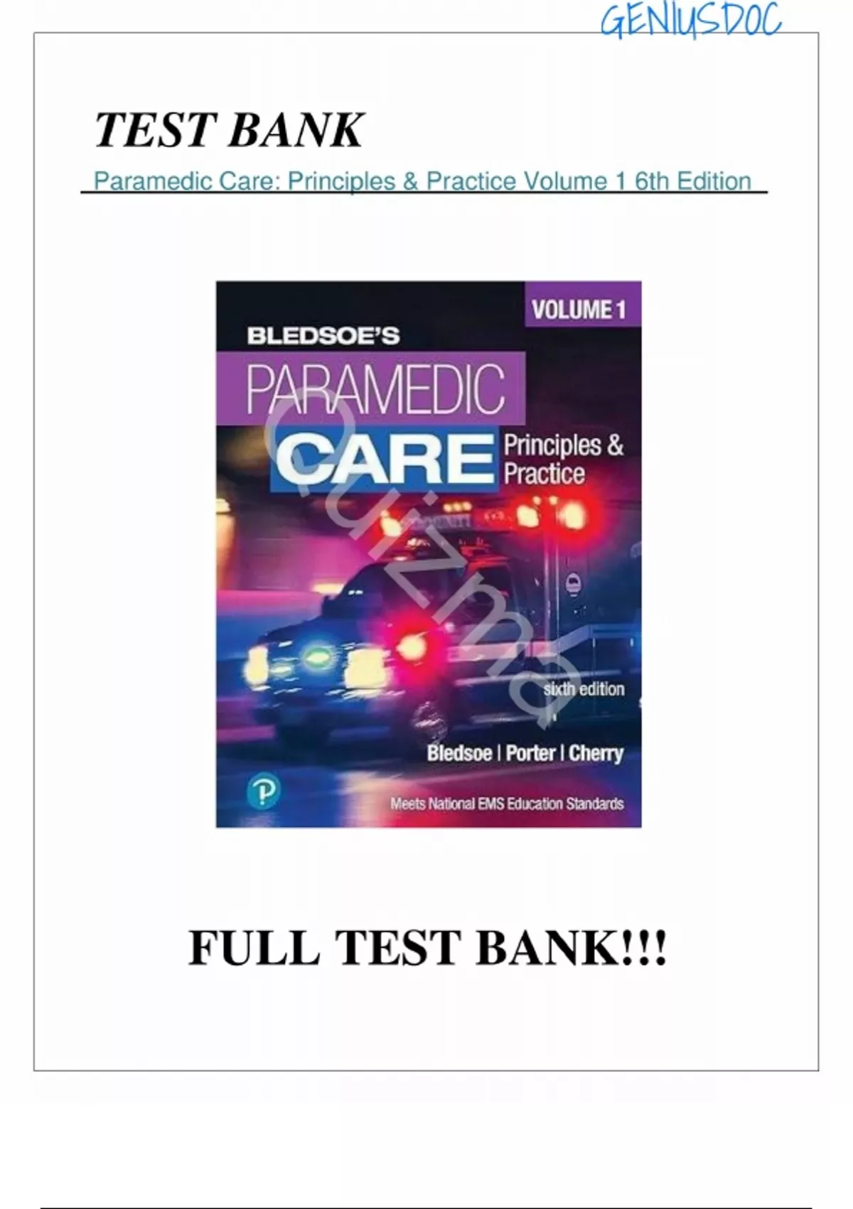 TEST BANK FOR PARAMEDIC CARE – PRINCIPLES AND PRACTISE 6th EDITION VOLUME 1 - 5 BY BRYAN BLEDSOE, ROBERT PORTER AND RICHARD CHERRY. ALL CHAPTERS. QUESTIONS AND ANSWERS