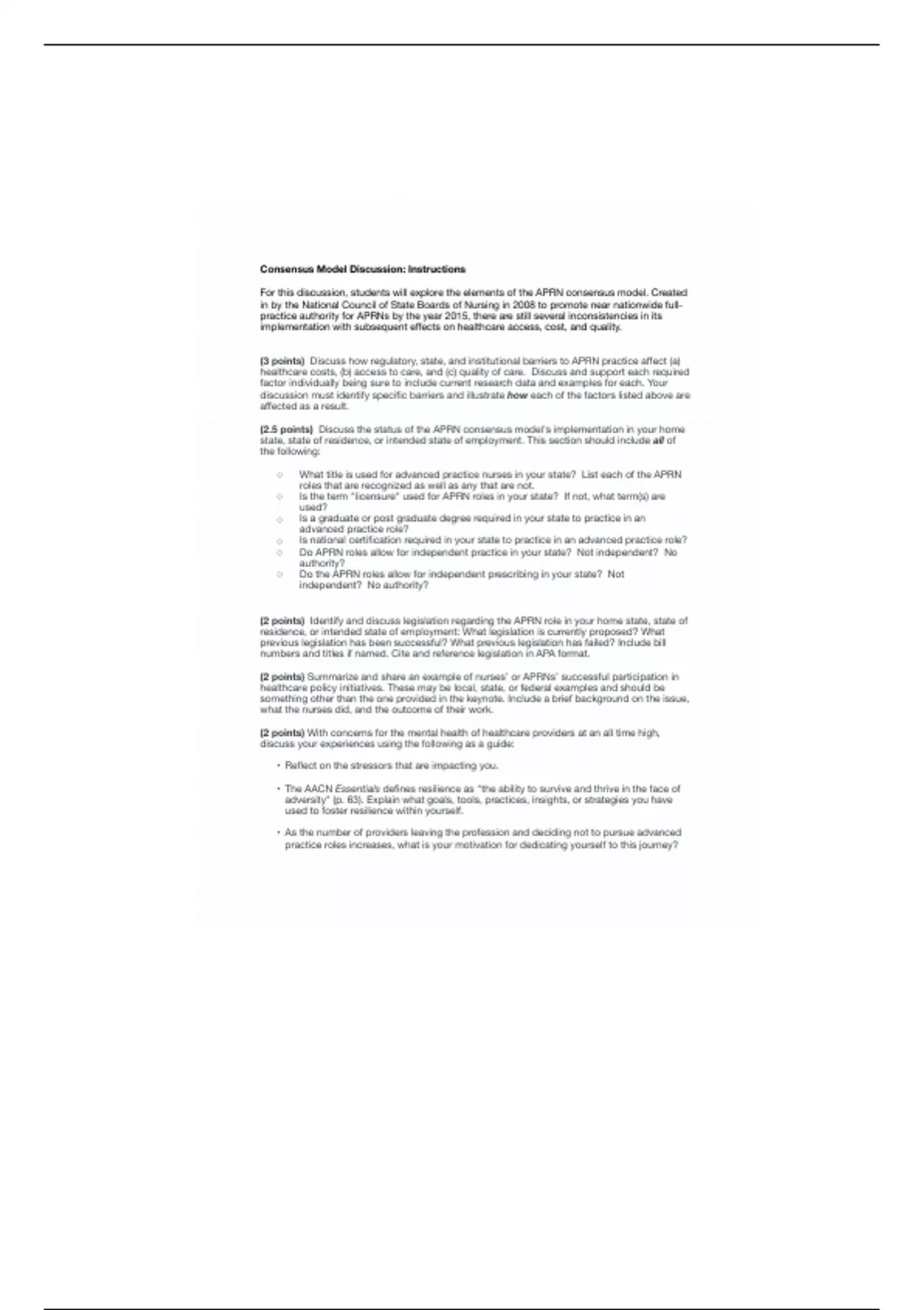 (2.5 points)# Discuss the status of the APRN consensus model's implementation in your home
