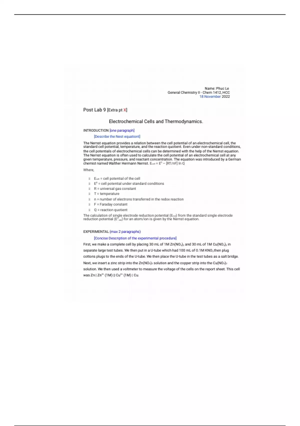 This is a comprehensive and assignment on;Experiment 9 Electrochemical Cells and Thermodynamics for Chem 1412. An Essential Study Resource just for YOU!!