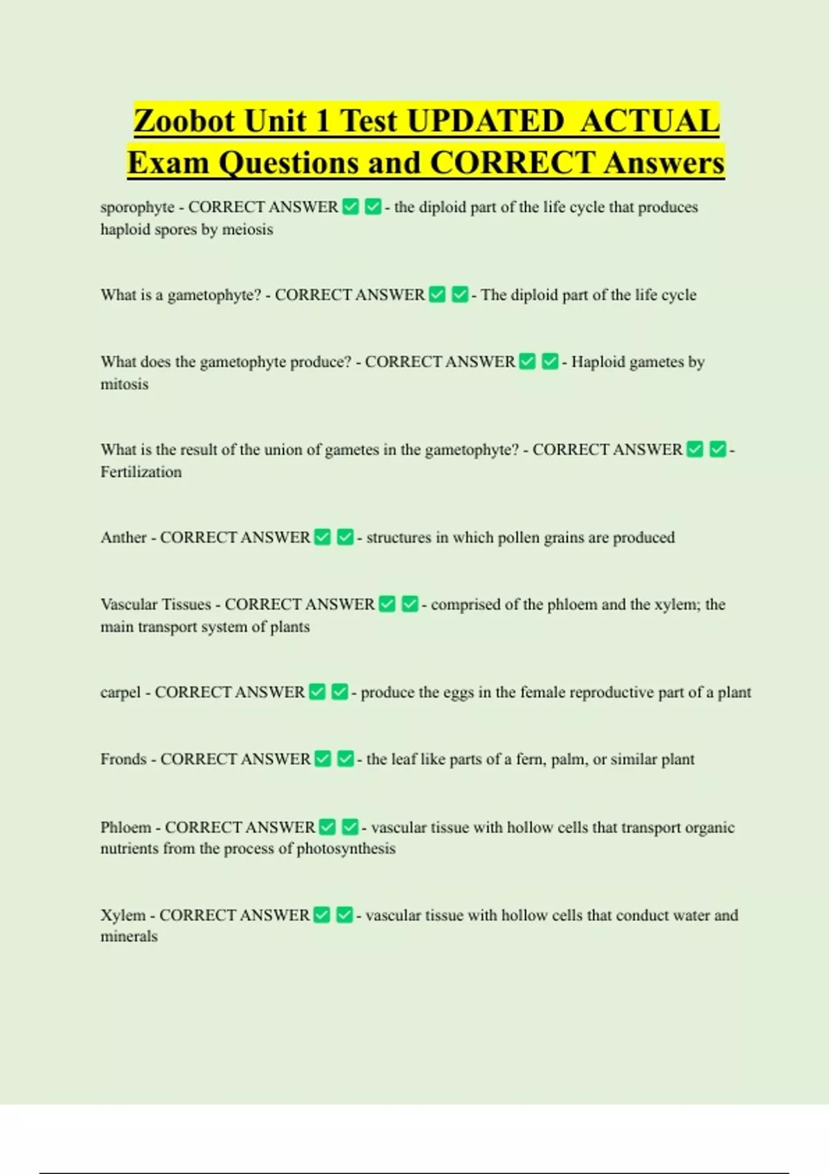 Zoobot Unit 1 Test UPDATED ACTUAL Exam Questions and CORRECT Answers sporophyte - CORRECT ANSWER - the diploid part of the life cycle that produces haploid spores by meiosis What is a gametophyte? - CORRECT ANSWER - The diploid part of the life cycle What does the gametophyte produce? - CORRECT ANSWER - Haploid gametes by mitosi