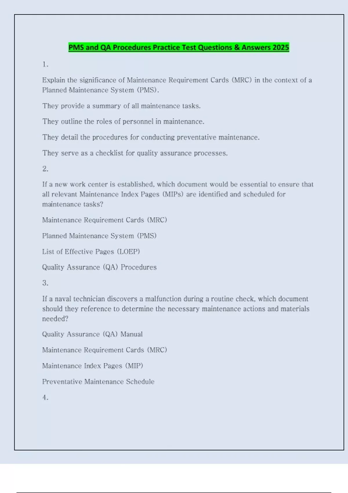 PMS and QA Procedures Practice Test Questions & Answers 2025 1. Explain the significance of Maintenance Requirement Cards (MRC) in the context of a Planned Maintenance System (PMS). They provide a summary of all maintenance tasks. They outline the roles of personnel in maintenance. They detail the procedures for conducting preventative maintenance. They serve as a checklist for quality assurance processes. 2. If a new work center is established, which document would be essential to ensure that all relevant Maintenance Index Pages (MIPs) are identified and scheduled for maintenance tasks? Maintenance Requirement Cards (MRC) Planned Maintenance System (PMS) List of Effective Pages (LOEP) Quality Assurance (QA) Procedures 3. If a naval technician discovers a malfunction during a routine check, which document should they reference to determine the necessary maintenance actions and materials needed?