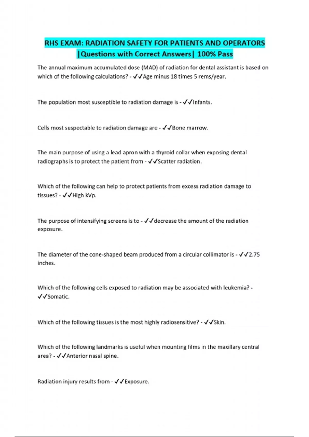 RHS EXAM: RADIATION SAFETY FOR PATIENTS AND OPERATORS |Questions with Correct Answers| 100% Pass
