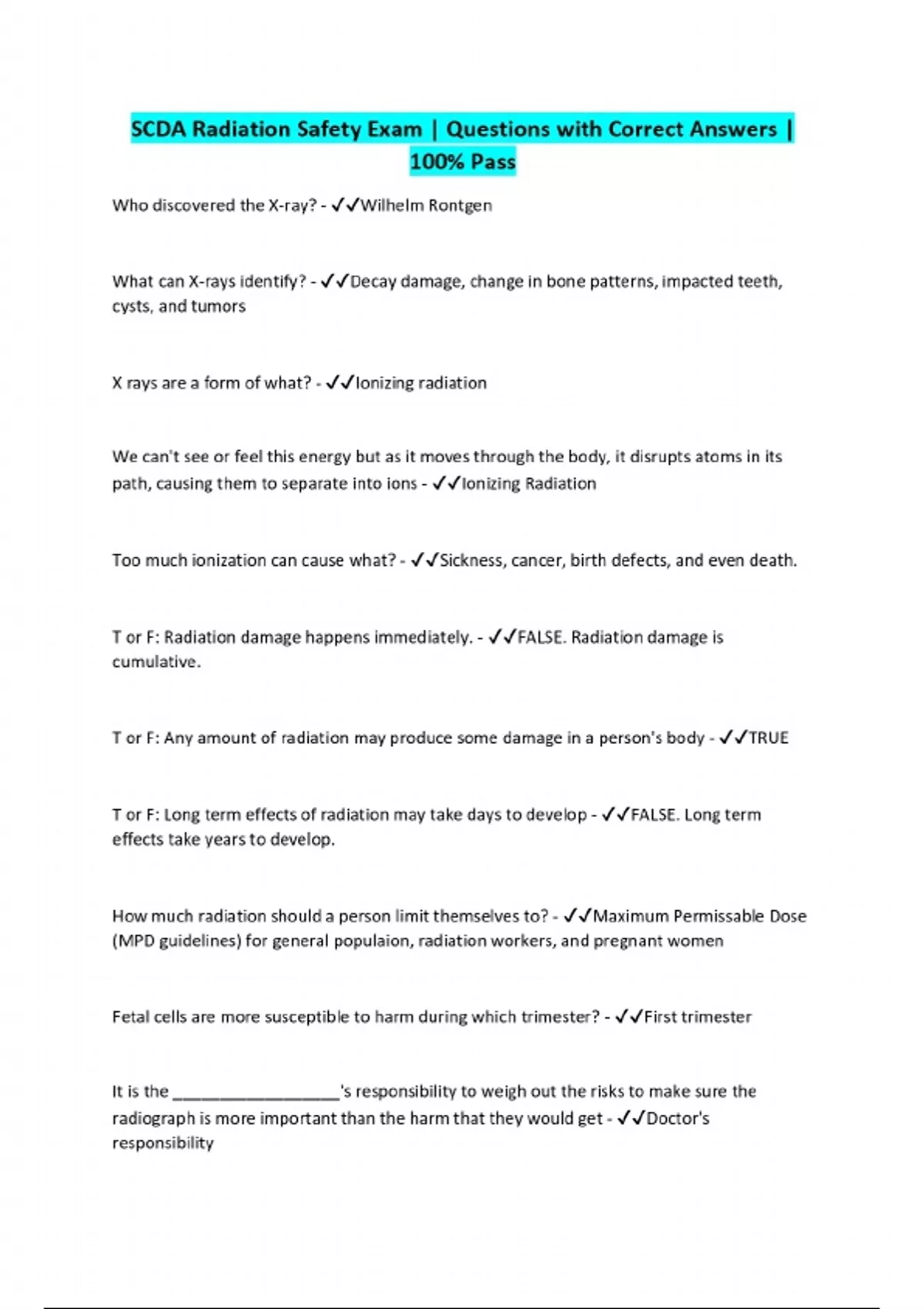 SCDA Radiation Safety Exam | Questions with Correct Answers | 100% Pass