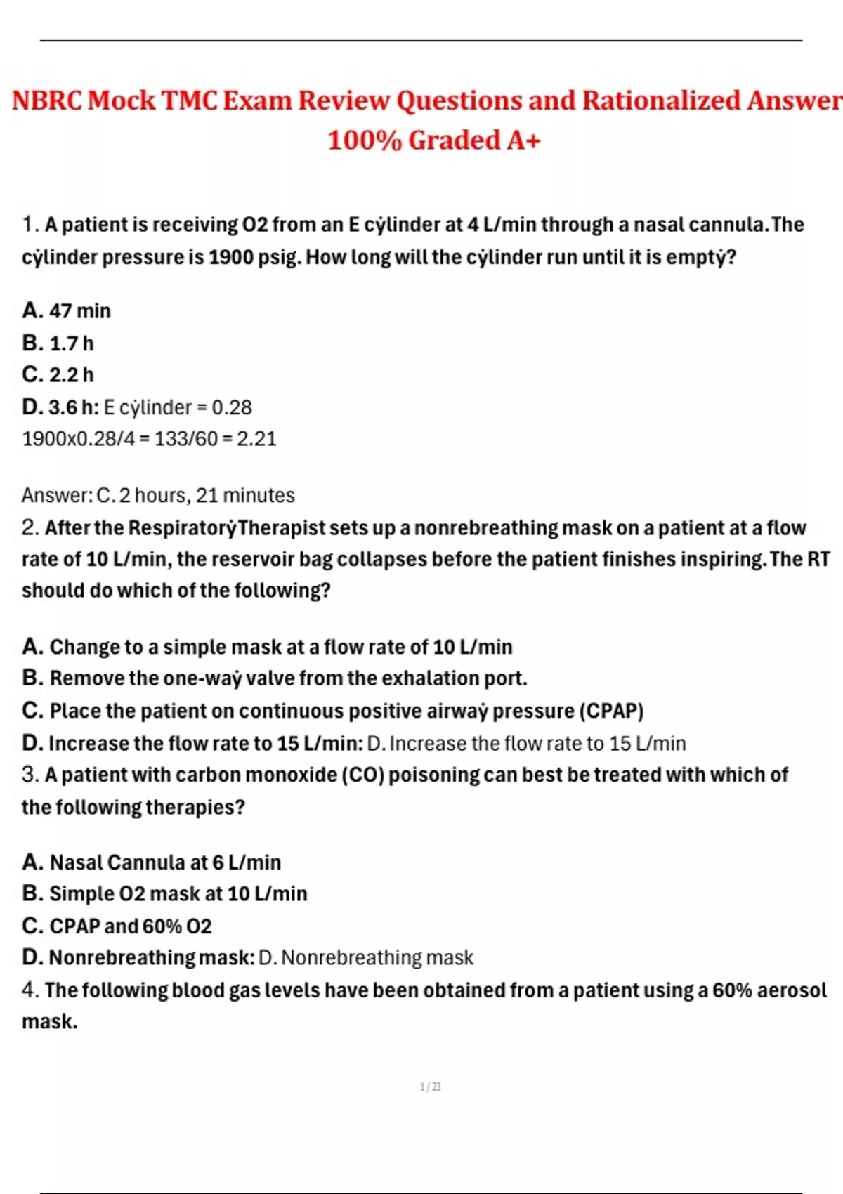 1. A patient is receiving O2 from an E cẏlinder at 4 L/min through a nasal cannula. The
