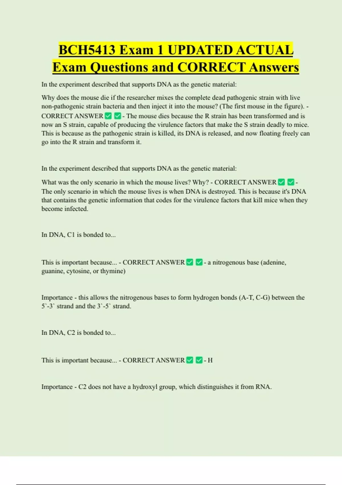 BCH5413 Exam 1 UPDATED ACTUAL Exam Questions and CORRECT Answers In the experiment described that supports DNA as the genetic material: Why does the mouse die if the researcher mixes the complete dead pathogenic strain with live non-pathogenic strain bacteria and then inject it into the mouse? (The first mouse in the figure). - CORRECT ANSWER - The mouse dies because the R strain has been transformed and is now an S strain, capable of producing the virulence factors that make the S strain deadly to mice. This is because as the pathogenic strain is killed, its DNA is released, and now floating freely can go into the R strain and transform it.