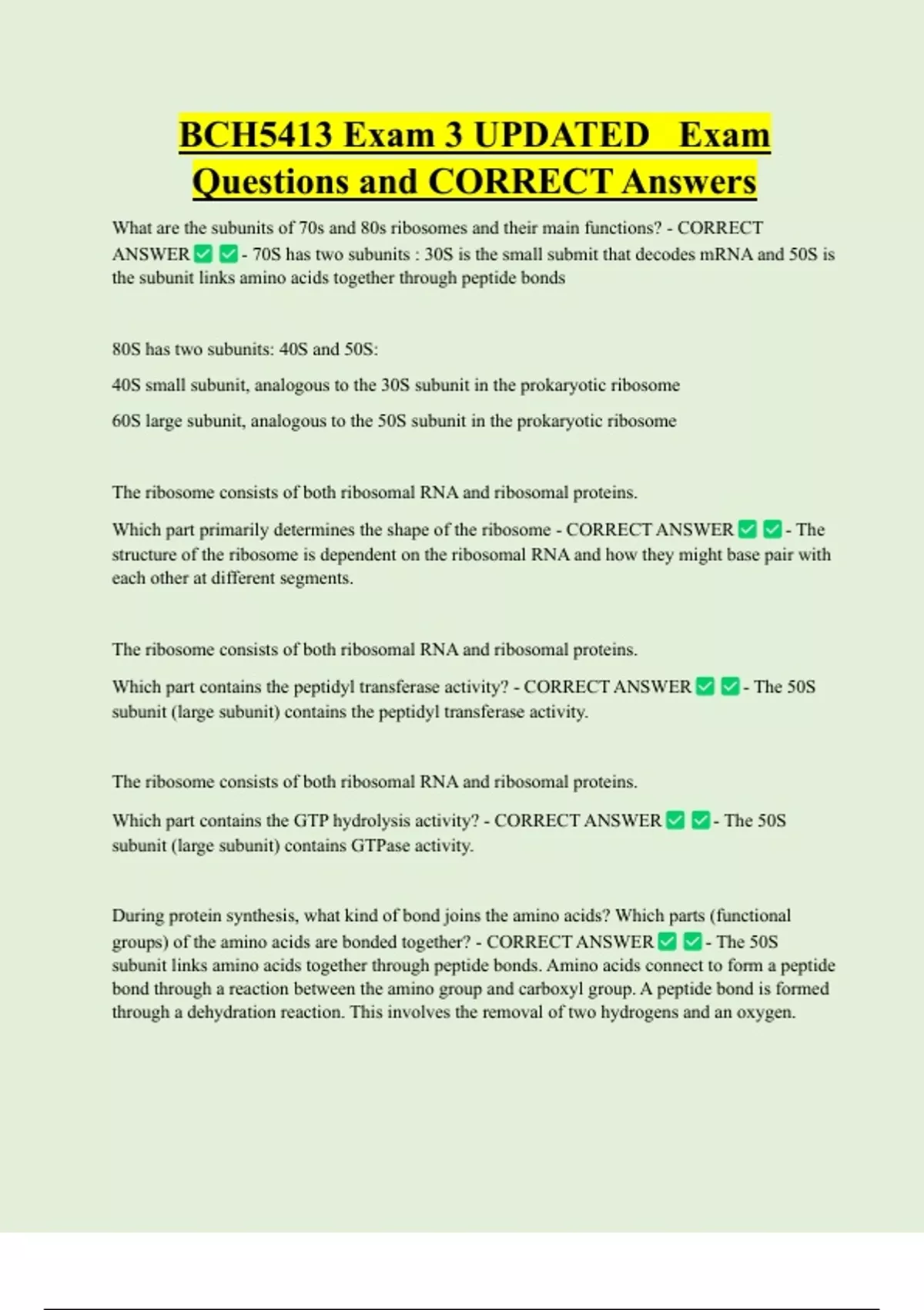 BCH5413 Exam 3 UPDATED Exam Questions and CORRECT Answers What are the subunits of 70s and 80s ribosomes and their main functions? - CORRECT ANSWER - 70S has two subunits : 30S is the small submit that decodes mRNA and 50S is the subunit links amino acids together through peptide bonds 80S has two subunits: 40S and 50S: 40S small subunit, analogous to the 30S subunit in the prokaryotic ribosome 60S large subunit, analogous to the 50S subunit in the prokaryotic ribosom