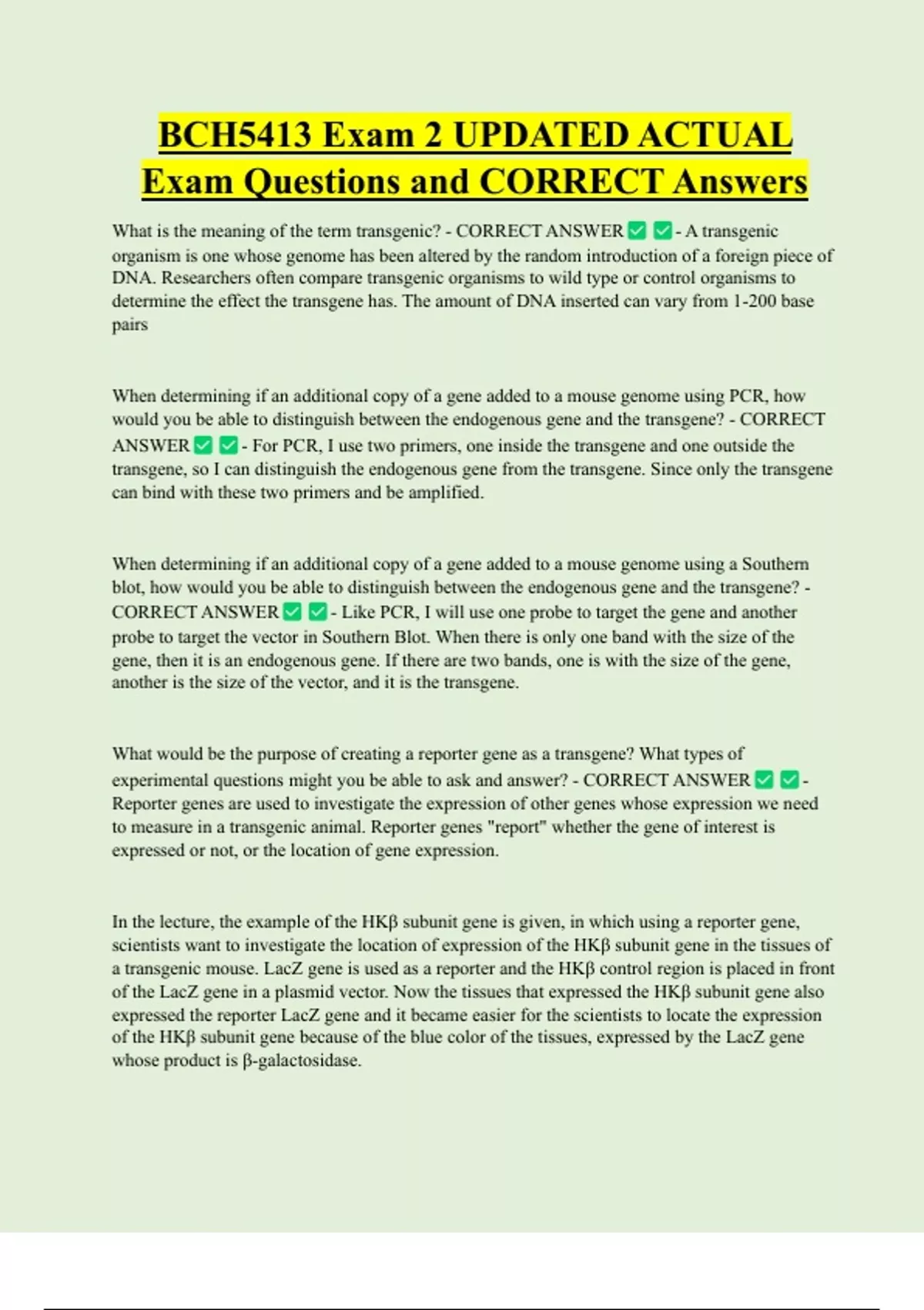 BCH5413 Exam 2 UPDATED ACTUAL Exam Questions and CORRECT Answers What is the meaning of the term transgenic? - CORRECT ANSWER - A transgenic organism is one whose genome has been altered by the random introduction of a foreign piece of DNA. Researchers often compare transgenic organisms to wild type or control organisms to determine the effect the transgene has. The amount of DNA inserted can vary from 1-200 base pairs