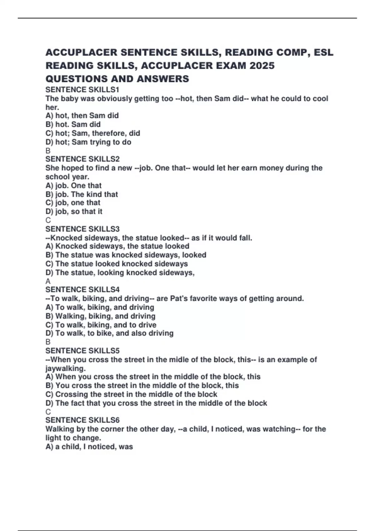 ACCUPLACER SENTENCE SKILLS, READING COMP, ESL READING SKILLS, ACCUPLACER EXAM 2025 QUESTIONS AND ANSWERS SENTENCE SKILLS1 The baby was obviously getting too --hot, then Sam did-- what he could to cool her. A) hot, then Sam did B) hot. Sam did C) hot; Sam, therefore, did D) hot; Sam trying to do B SENTENCE SKILLS2 She hoped to find a new --job. One that-- would let her earn money during the school year. A) job. One that B) job. The kind that C) job, one that D) job, so that it C SENTENCE SKILLS3 --Knocked sideways, the statue looked-- as if it would fall. A) Knocked sideways, the statue looked B) The statue was knocked sideways, looked C) The statue looked knocked sideways D) The statue, looking knocked sideways, A