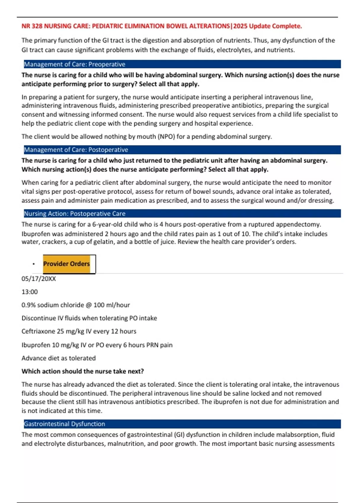 NR 328 NURSING CARE: PEDIATRIC ELIMINATION BOWEL ALTERATIONS|2025 Update Complete.