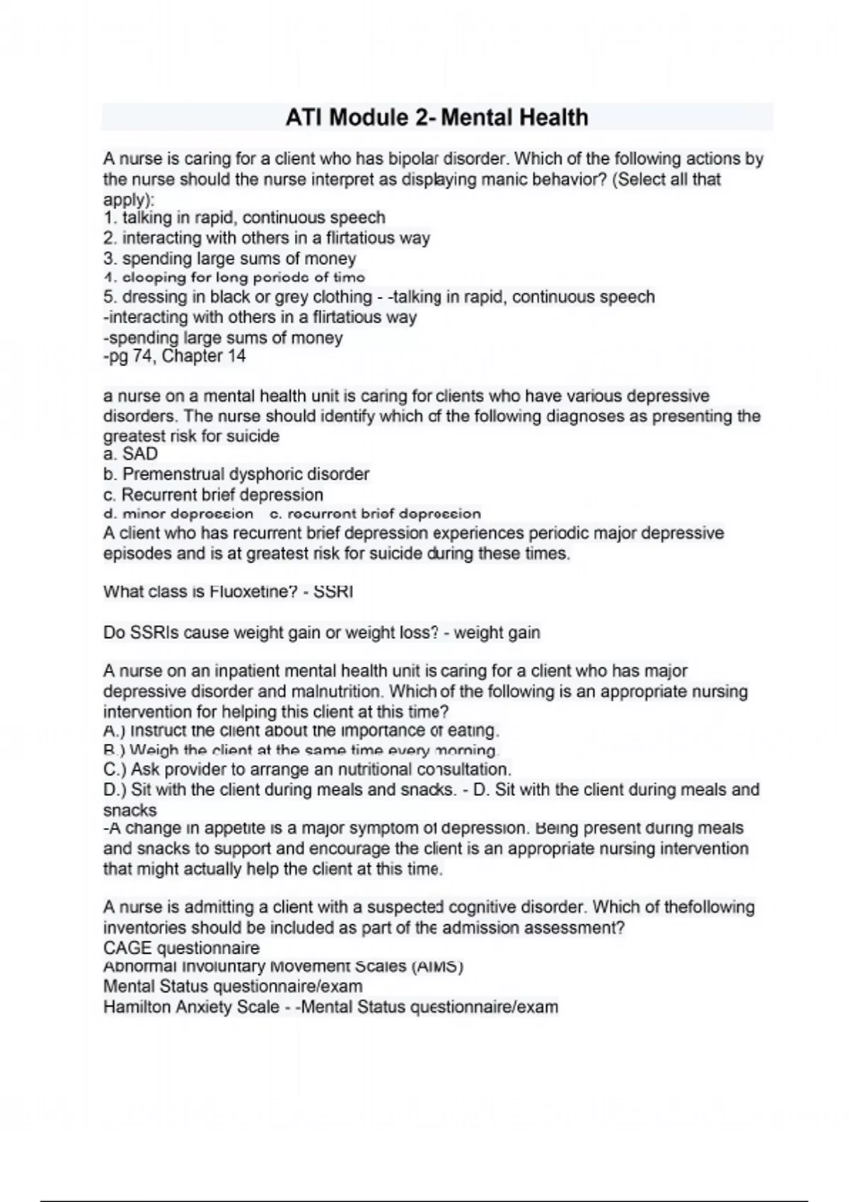 A nurse is caring for a client who has bipolar disorder. Which of the following actions by the nurse should the nurse interpret as displaying manic behavior? (Select all that apply): 1. talking in rapid, continuous speech 2. interacting with others in a flirtatious way 3. spending large sums of money 4. sleeping for long periods of time 5. dressing in black or grey clothing - -talking in rapid, continuous speech -interacting with others in a flirtatious way -spending large sums of money -pg 74, Chapter 14 a nurse on a mental health unit is caring for clients who have various depressive disorders. The nurse should identify which of the following diagnoses as presenting the greatest risk for suicide a. SAD b. Premenstrual dysphoric disorder c. Recurrent brief depression d. minor depression - c. recurrent brief depression A client who has recurrent brief depression experiences periodic major depressive episodes and is at greatest risk for suicide during these times. What class is Fluoxetine? - SSRI Do SSRIs cause weight gain or weight loss? - weight gain A nurse on an inpatient mental health unit is caring for a client who has major depressive disorder and malnutrition. Which of the following is an appropriate nursing intervention for helping this client at this time? A.) Instruct the client about the importance of eating. B.) Weigh the client at the same time every morning. C.) Ask provider to arrange an nutritional consultation. D.) Sit with the client during meals and snacks. - D. Sit with the client during meals and snacks -A change in appetite is a major symptom of depression. Being present during meals and snacks to support and encourage the client is an appropriate nursing intervention that might actually help the client at this time. A nurse is admitting a client with a suspected cognitive disorder. Which of thefollowing inventories should be included as part of the admission assessment? CAGE questionnaire Abnormal Involuntary Movement Scales (AIMS) Mental Status questionnaire/exam Hamilton Anxiety Scale - -Mental Status questionnaire/exam The use of a mental status questionnaire assists in identifying deterioration in mental status and brain damage which are findings associated with cognitive disorders. Citalopram class? - SSRI A nurse is caring for a client who is a resident in a facility designed for the care of clients with Alzheimer disease.The client has been oriented to name and place and is usually cooperative and able to perform activities of dailyliving (ADL) with minimal supervision. When the client refuses to take medications, the nurse should - D A. notify the provider of the client's increasing confusion.Rationale:Before taking this action, the nurse must make a further assessment regarding the reasons forrefusal. B. crush the pills, if not contraindicated, and mix them in the client's applesauce.Rationale:A confused client can still make valid health care choices. This action does not allow the clientto make a choice. C. explain to the client the possible implications of missing a dose.Rationale:Being confrontational may cause the client to become argumentative and distrustful. D. ask the client to express the reasons for refusing the morning medications and document the event.Rationale:Before making a judgment about the client's competence, the nurse should complete anassessment of the client. It is important to document the client's reasons in his own words,especially if he is refusing ordered medications and/or treatments Why should patients change positions slowly when taking MAOIs? - Because MAOIs can cause orthostatic hypotension A nurse is caring for a client who has been hospitalized for treatment of bipolar disorder and will be discharged with a prescription for lithium. The nurse's discharge teaching should include information cautioning against which of the following behaviors that may cause lithium toxicity? A. Fasting B. Drinking caffeine C. Excercising moderately - A. Fasting Lithium is used to treat the manic stage of bipolar disorder. Toxicity occurs when the level of lithium in the blood becomes too high. Crash dieting or fasting can lead to lithium toxicity because the sodium, electrolyte, and fluid balance are altered, causing the blood levels of lithium to rise.