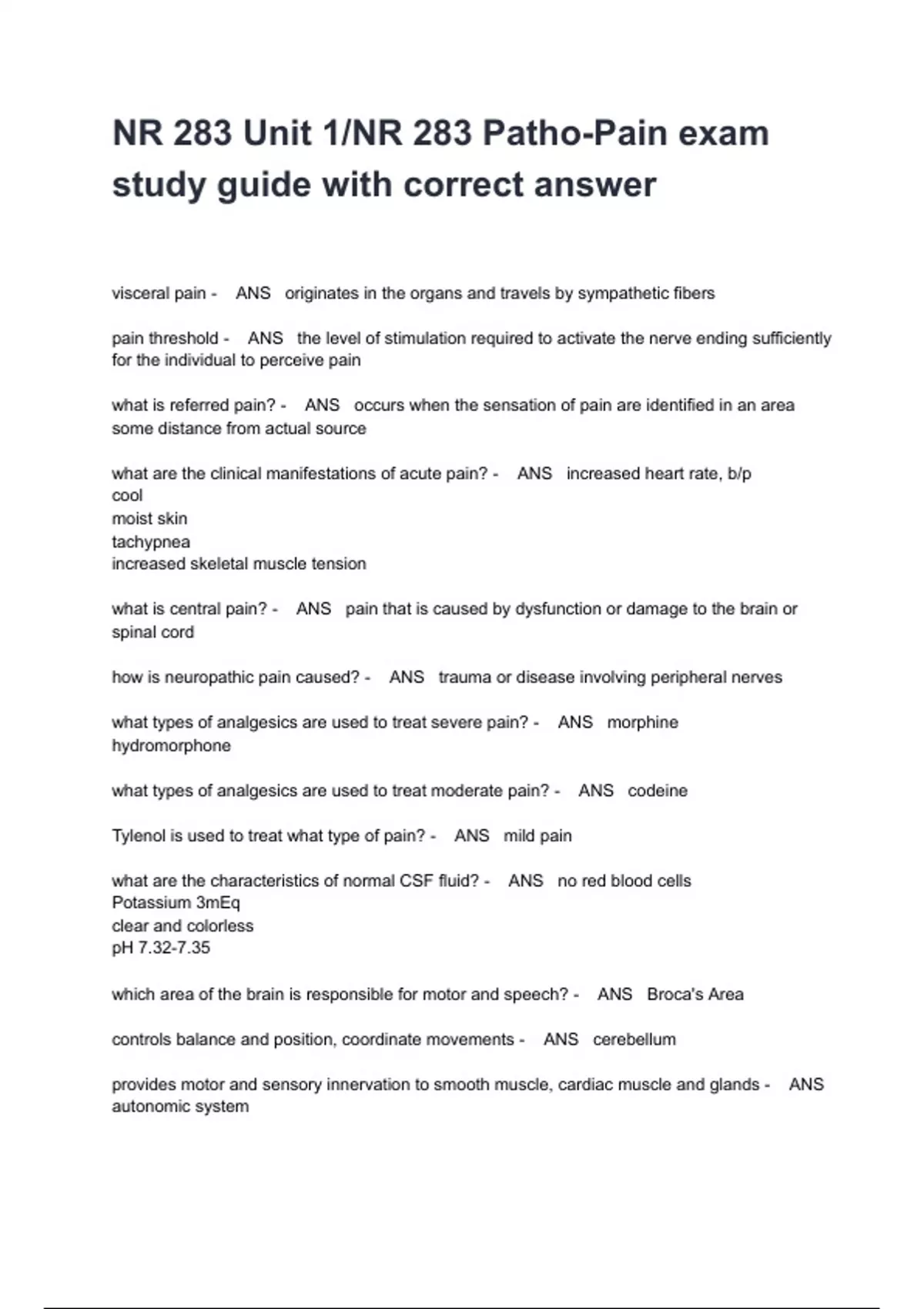 NR 283 Unit 1/NR 283 Patho-Pain exam study guide with correct answer