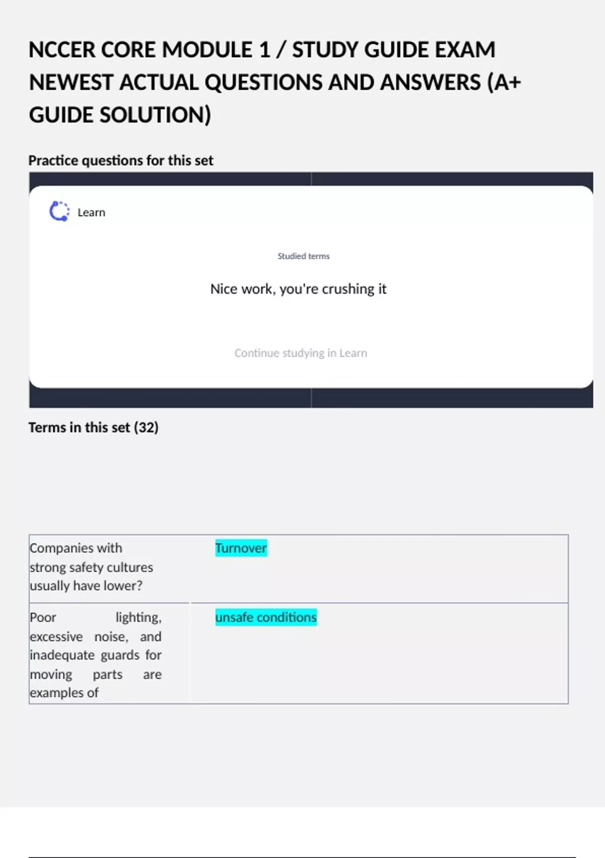 NCCER CORE MODULE 1 / STUDY GUIDE EXAM NEWEST ACTUAL QUESTIONS AND ANSWERS (A+ GUIDE SOLUTION) Practice questions for this set Terms in this set (32) Companies with strong safety cultures usually have lower? Turnover Poor lighting, excessive noise, and inadequate guards for moving parts are examples of unsafe conditions The activity that consists of breaking a job into its component tasks and then analyzing each step for potential hazards is called a _____. Job Safety Analysis A measure of the probability, consequences, and exposure related to an event is referred to as _____. Risk