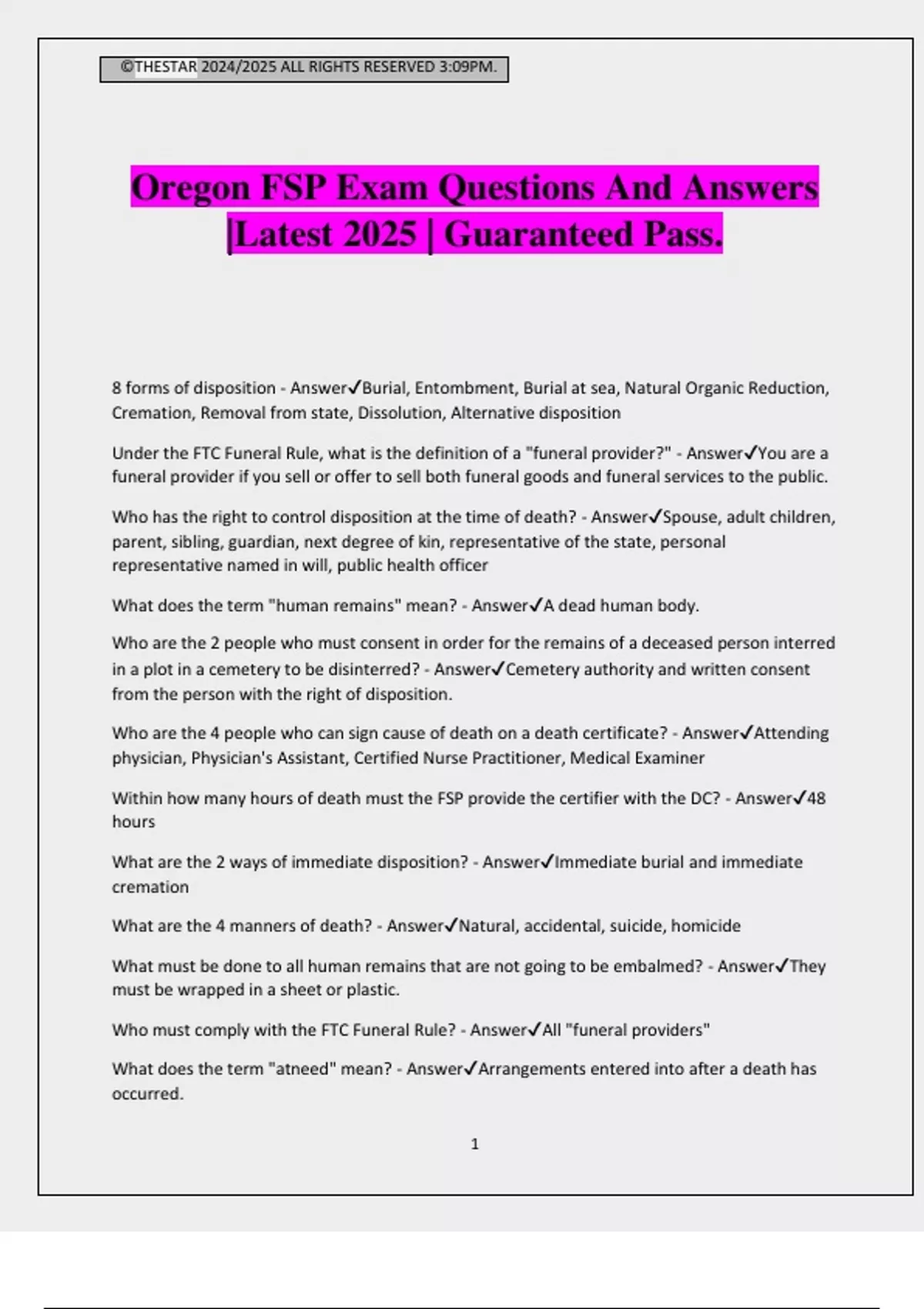 ©THESTAR 2024/2025 ALL RIGHTS RESERVED 3:09PM. 1 Oregon FSP Exam Questions And Answers |Latest 2025 | Guaranteed Pass. 8 forms of disposition - AnswerBurial, Entombment, Burial at sea, Natural Organic Reduction, Cremation, Removal from state, Dissolution, Alternative disposition Under the FTC Funeral Rule, what is the definition of a "funeral provider?" - AnswerYou are a funeral provider if you sell or offer to sell both funeral goods and funeral services to the public. Who has the right to control disposition at the time of death? - AnswerSpouse, adult children, parent, sibling, guardian, next degree of kin, representative of the state, personal representative named in will, public health officer What does the term "human remains" mean? - AnswerA dead human body. Who are the 2 people who must consent in order for the remains of a deceased person interred in a plot in a cemetery to be disinterred? - AnswerCemetery authority and written consent from the person with the right of disposition. Who are the 4 people who can sign cause of death on a death certificate? - AnswerAttending physician, Physician's Assistant, Certified Nurse Practitioner, Medical Examiner Within how many hours of death must the FSP provide the certifier with the DC? - Answer48 hours What are the 2 ways of immediate disposition? - AnswerImmediate burial and immediate cremation What are the 4 manners of death? - AnswerNatural, accidental, suicide, homicide What must be done to all human remains that are not going to be embalmed? - AnswerThey must be wrapped in a sheet or plastic. Who must comply with the FTC Funeral Rule? - AnswerAll "funeral providers" What does the term "atneed" mean? - AnswerArrangements entered into after a death has occurred. ©THESTAR 2024/2025 ALL RIGHTS RESERVED 3:09PM. 2 What are the 2 definitions of fetal death? - Answer350 grams or more, 20 completed weeks of gestation or more. What are the 3 things that veterans are entitled to? - AnswerBurial in a national cemetery, a marker, and a flag What is the current 1 time death benefit amount for social security? - Answer$255 Who is eligible to receive the social security death benefit? - AnswerSpouse or dependent child When remains are going to be buried or entombed, where must the ID metal disk be placed on the casket? - AnswerOn the back side of the head end, behind the handle. When is the only circumstance a cemetery or crematory can accept remains without an ID metal disk? - AnswerIf death occurred outside of Oregon. What is the required temperature of a cooler for human remains? - Answer36F or less How many times a year must the state board offer the exam for FSP or Embalmer? - AnswerAt least once per year. What is the VA form number for application for burial benefits? - Answer21-530 Funeral rule: Do you have to list all 16 required items on the GPL if you do not offer them? - AnswerNo, only list the items you do offer. What is the required identifying information on the GPL? - AnswerName, address, and telephone number, "General Price List," effective date What is the annual fee for endowment care cemeteries that do up to 100 interments per year? Over 100? - Answer$40 and $100 Within how many hours must the embalmed body of an indigent person be delivered to OHSU for donation? - Answer72 hours WIthin how many days after death must the DC be submitted to the county registrar? - Answer5 days What are the 5 items that should be included on the apprentice FSP log? - AnswerName of deceased, date and place of death, date arrangements were made, apprentice participation, number of days and hours worked per week, Abuse of a memorial to the dead is considered a... - AnswerClass A misdemeanor After human remains have been released to the crematory, within how many hours should they be cremated and processed? - Answer48 hours ©THESTAR 2024/2025 ALL RIGHTS RESERVED 3:09PM. 3 Abuse of a corpse in the first degree is a... - AnswerClass B felony What are the 11 communicable diseases that would require embalming before transportation? - AnswerAIDS, HIV, diphtheria, hemorrhagic fever, Hep B, Hep C, Hep Delta, plague, rabies, tularemia, TB What wording must be printed at the bottom of all at need, pre arrangement or preconstruction contracts for death care goods and services? Minimum font size for this wording? - AnswerThis facility is licensed by the Oregon State Mortuary and Cemetery Board. 10 point font. What is the percentage of the amount received in payment of a nonguaranteed prearrangement sales contract or a nonguaranteed preconstruction sales contract that must be deposited into the trust account? - Answer100% Within how many business days of their receipt must the funds be deposited? - Answer5 business days. What are the 5 pieces of information that must be affixed to either a temporary or permanent cremated remains container? - AnswerDeceased's name, date of death, ID metal disk #, name of funeral home, name of crematory If a Medical Examiner is unable to determine the identity of human remains, how many days do they have to notify the superintendent of state police with pertinent information? - AnswerNo later than 30 days Who shall renew their license on odd numbered years? - AnswerFuneral establishments, immediate disposition companies, cemeteries, crematories Within how many hours must human remains released to a cemetery authority be placed? - Answer24 hours. What is the form number for SS Statement of Death by Funeral Director form? - AnswerSSA- 721 What are the 8 types of death that require the Medical Examiner to investigate? - Answer1. Apparent homicide, suicide, or occurring under suspicious or unknown circumstance 2. Resulting from unla
