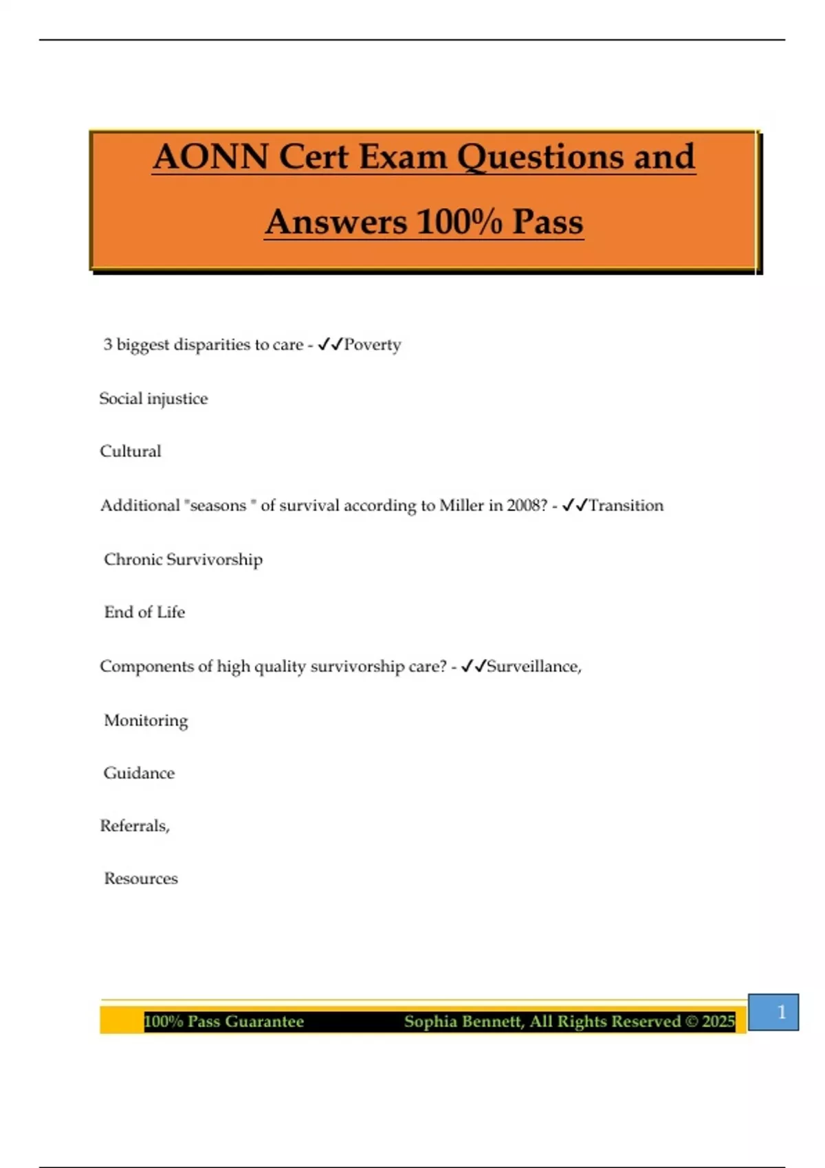 AONN Cert Exam Questions and Answers 100% Pass 3 biggest disparities to care - Poverty Social injustice Cultural Additional "seasons " of survival according to Miller in 2008? - Transition Chronic Survivorship End of Life Components of high quality survivorship care? - Surveillance, Monitoring Guidance Referrals, Resources 2100% Pass Guarantee Sophia Bennett, All Rights Reserved © 2025 Components of NCCN Standards if Care relating to patient distress (2014)? - Recognized, Monitored, Documented, Treated Properly What did American College of Surgeons Commission on Cancer (CoC) mandate about navigation? - 2012 Announcement: must implement pt navigator by 1/1/15 for CoC accreditation. Blaseg pointed out about fundamental navigation? - A clear scope of practice w/stop & start points will prevent overlap of the roles of other CoC require for accreditation in 2012? - Distress screening for every cancer patient Dr. Krok-Schoen report about patient navigation? - Navigation eliminates barrier to care Mitchell provide in 2010? - 6 tools for measuring distress in cancer patients Common Rule in 1981 Address? - Types of research, defined terms , set forth requirements for IRB Declaration of Helsinki of 1964 Address? - Well-being of subject is greater than interest of society, written consent IOM Report of 2013 Charting a New Course for System in Crisis say? - Engaged patient is a key component of high quality cancer care delivery....care is pt centered 3100% Pass Guarantee Sophia Bennett, All Rights Reserved © 2025 Willis publish regarding navigator role delineation framework? - The final framework is composed of 12 functional area domains w/differences between community health workers, pt navigators, & clinically licensed navigators described in each frame Healthy people 2020 say health is affected by? - Social determinants: economic stability, education, neighborhood, social & community, health & healthcare Quality of Life Model Include? - Physical , Psychological, Social, Wellbeing, Spiritual High Quality Cancer Care Delivery System - Evidence Based Practice, workforce, Pt/ clinician interactions Oncology Pathway - Most effective, least toxic, least costly