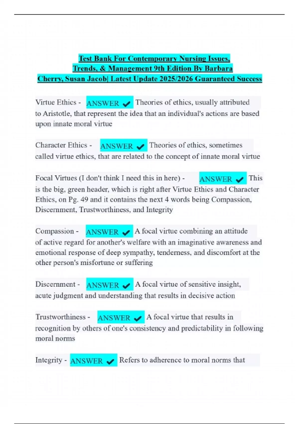 Test Bank For Contemporary Nursing Issues, Trends, & Management 9th Edition By Barbara Cherry, Susan Jacob| Latest Update 2025/2026 Guaranteed Success