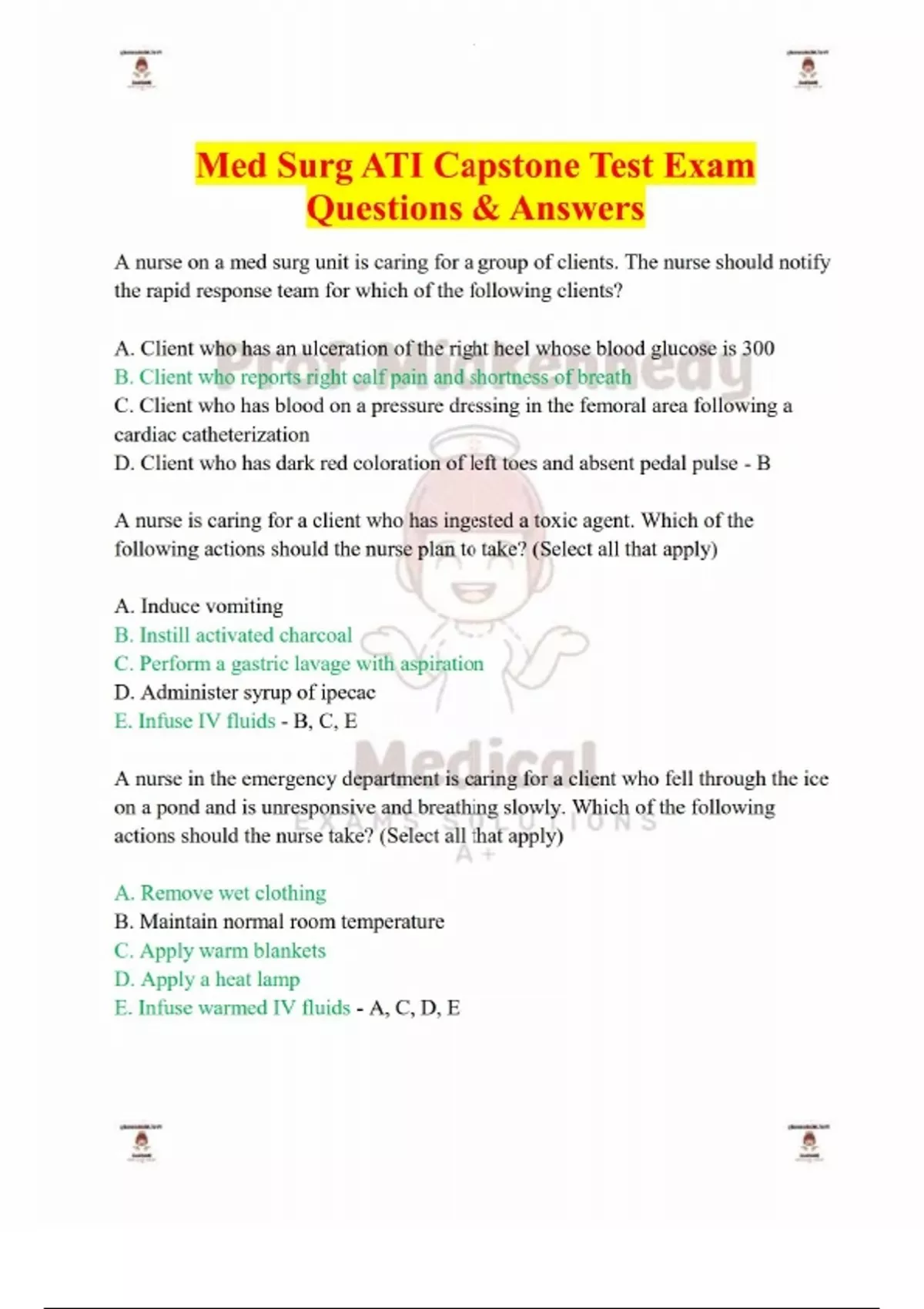 Med Surg ATI Capstone Test Exam Questions & Answers-A nurse on a med surg unit is caring for a group of clients. The nurse should notify the rapid response team for which of the following clients? A. Client who has an ulceration of the right heel whose blood glucose is 300 B. Client who reports right calf pain and shortness of breath C. Client who has blood on a pressure dressing in the femoral area following a cardiac catheterization D. Client who has dark red coloration of left toes and absent pedal pulse - B A nurse is caring for a client who has ingested a toxic agent. Which of the following actions should the nurse plan to take? (Select all that apply) A. Induce vomiting B. Instill activated charcoal C. Perform a gastric lavage with aspiration D. Administer syrup of ipecac E. Infuse IV fluids - B, C, E A nurse in the emergency department is caring for a client who fell through the ice on a pond and is unresponsive and breathing slowly. Which of the following actions should the nurse take? (Select all that apply) A. Remove wet clothing B. Maintain normal room temperature C. Apply warm blankets D. Apply a heat lamp E. Infuse warmed IV fluids - A, C, D, E A nurse in the ED is assessing a client who is unresponsive. The client's partner states, "He was pulling weeds in the yard and slumped to the ground." Which of the following techniques should the nurse use to open the client's airway? A. Head-tilt, chin-lift B. Modified jaw thrust C. Hyperextension of the head D. Flexion of the head - A A nurse is reviewing the common emergency management protocol for clients who have asystole. Which of the following actions should the nurse plan to take during this cardiac emergency? A. Perform defibrillation B. Prepare for transcutaneous pacing C. Administer IV epinephrine D. Elevate the client's lower extremities - C