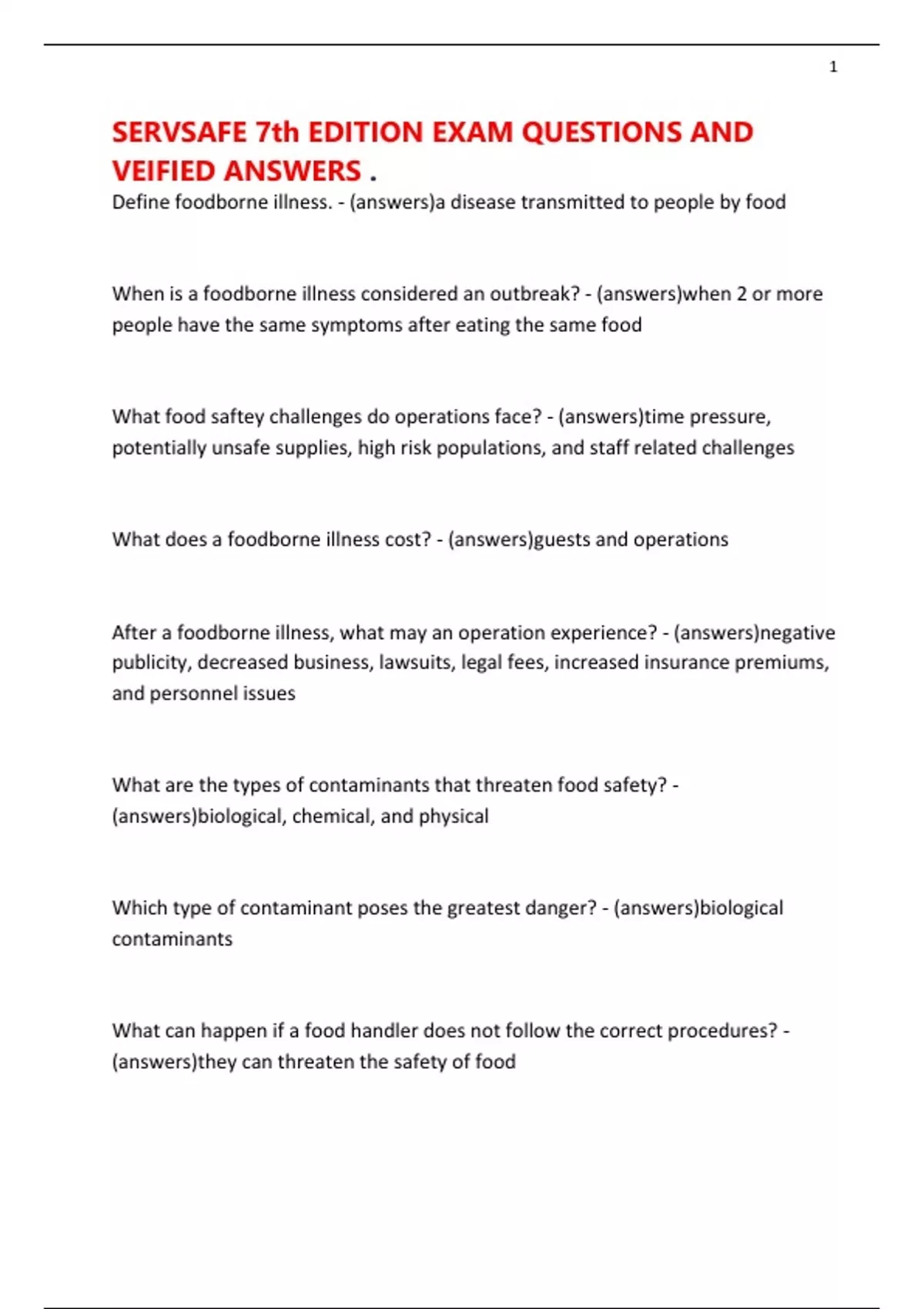 SERVSAFE 7th EDITION EXAM QUESTIONS AND VEIFIED ANSWERS .