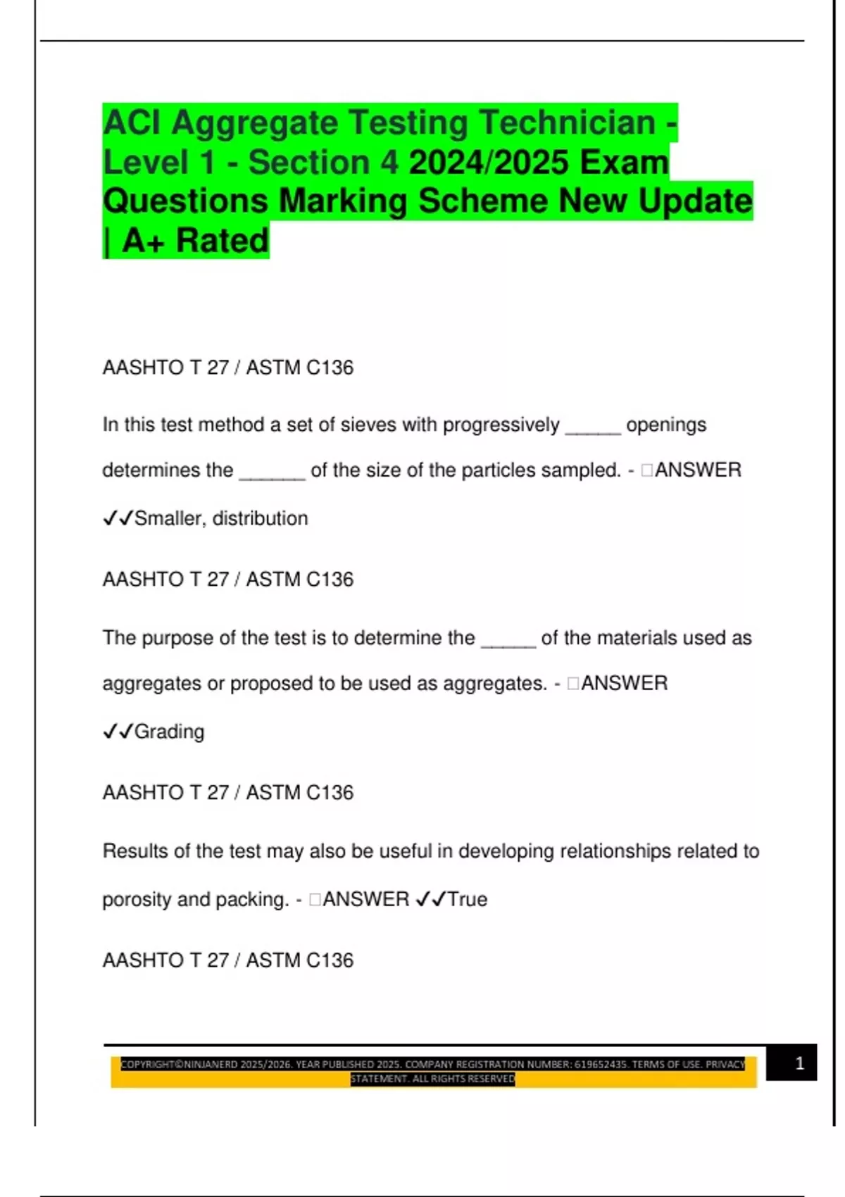 ACI Aggregate Testing Technician - Level 1 - Section 4 2024/2025 Exam Questions Marking Scheme New Update | A+ Rated