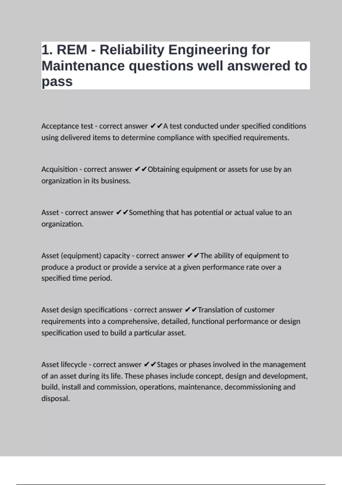 1. REM - Reliability Engineering for Maintenance questions well answered to pass
