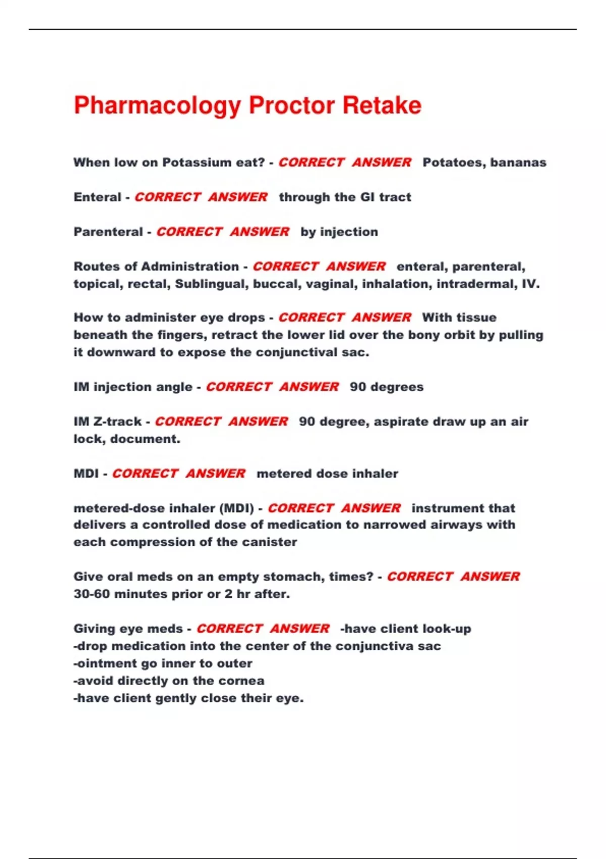Pharmacology Proctor Retake When low on Potassium eat? - CORRECT ANSWER Potatoes, bananas Enteral - CORRECT ANSWER through the GI tract Parenteral - CORRECT ANSWER by injection Routes of Administration - CORRECT ANSWER enteral, parenteral, topical, rectal, Sublingual, buccal, vaginal, inhalation, intradermal, IV. How to administer eye drops - CORRECT ANSWER With tissue beneath the fingers, retract the lower lid over the bony orbit by pulling it downward to expose the conjunctival sac. IM injection angle - CORRECT ANSWER 90 degrees IM Z-track - CORRECT ANSWER 90 degree, aspirate draw up an air lock, document. MDI - CORRECT ANSWER metered dose inhaler metered-dose in