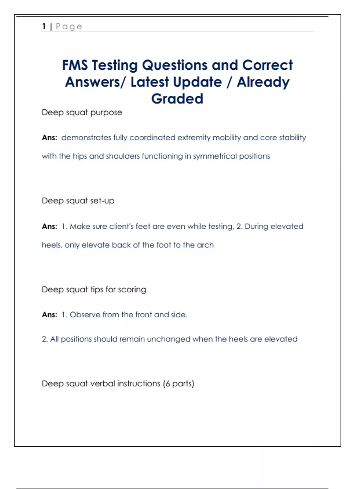 Deep squat purpose Ans: demonstrates fully coordinated extremity mobility and core stability with the hips and shoulders functioning in symmetrical positions Deep squat set-up Ans: 1. Make sure client's feet are even while testing, 2. During elevated heels, only elevate back of the foot to the arch Deep squat tips for scoring Ans: 1. Observe from the front and side. 2. All positions should remain unchanged when the heels are elevated Deep squat verbal instructions (6 parts) 2 | P a g e Ans: 1. Stand with your feet approximately should width apart and toes pointing forward 2. Grasp the dowel in both hands and place it horizontally on top of your head so your shoulders and elbows are 90 degrees 3. Press the dowel so that it is directly above your head 4. While maintaining an upright torso, and keeping your heels and the dowel in position, descend as deep as possible 5. Hold the descended position for a count of one, then return to the starting position. 6. Do you understand
