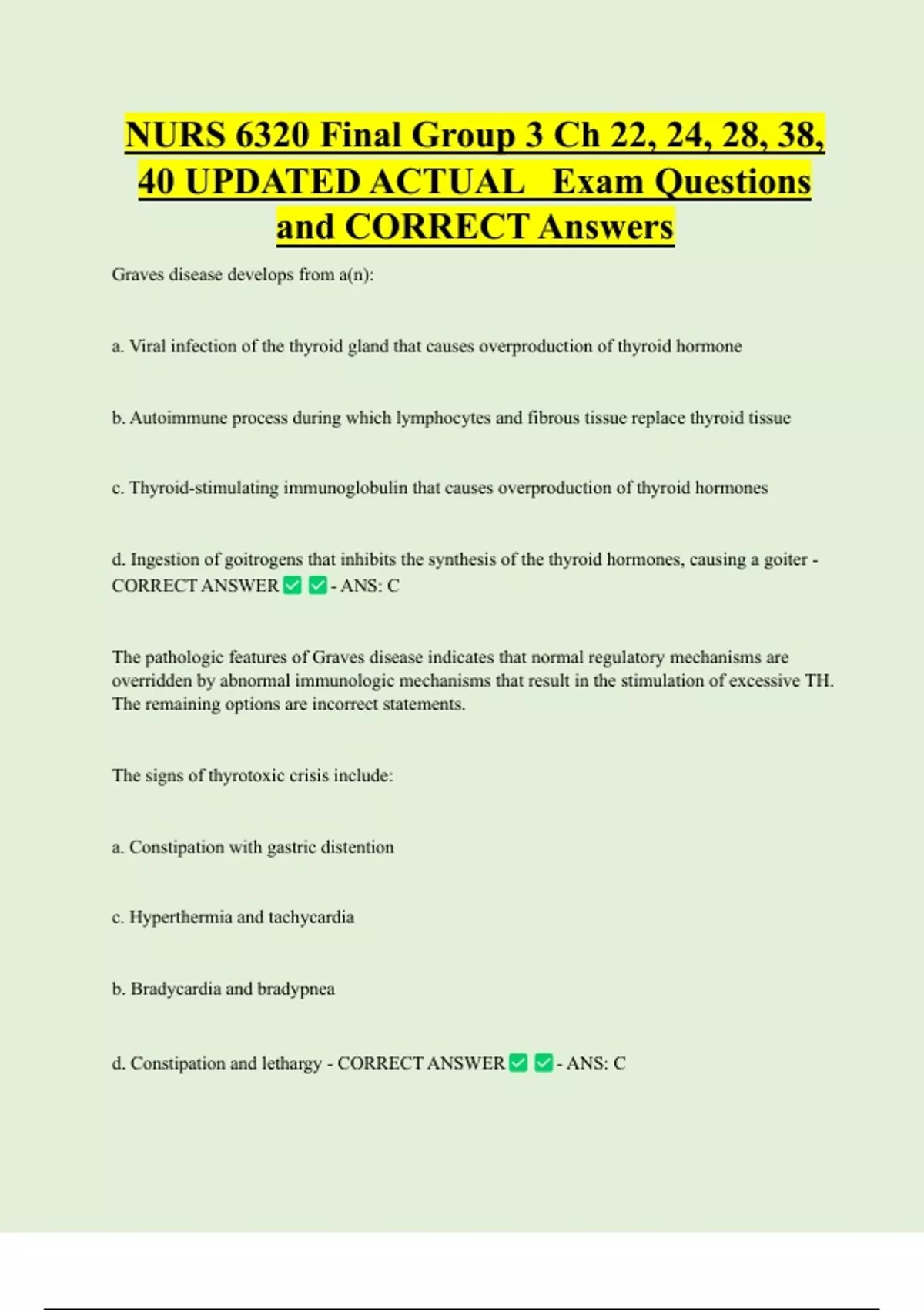 NURS 6320 Final Group 3 Ch 22, 24, 28, 38, 40 UPDATED ACTUAL Exam Questions and CORRECT Answers Graves disease develops from a(n): a. Viral infection of the thyroid gland that causes overproduction of thyroid hormone b. Autoimmune process during which lymphocytes and fibrous tissue replace thyroid tissue c. Thyroid-stimulating immunoglobulin that causes overproduction of thyroid hormones d. Ingestion of goitrogens that inhibits the synthesis of the thyroid hormones, causing a goiter -