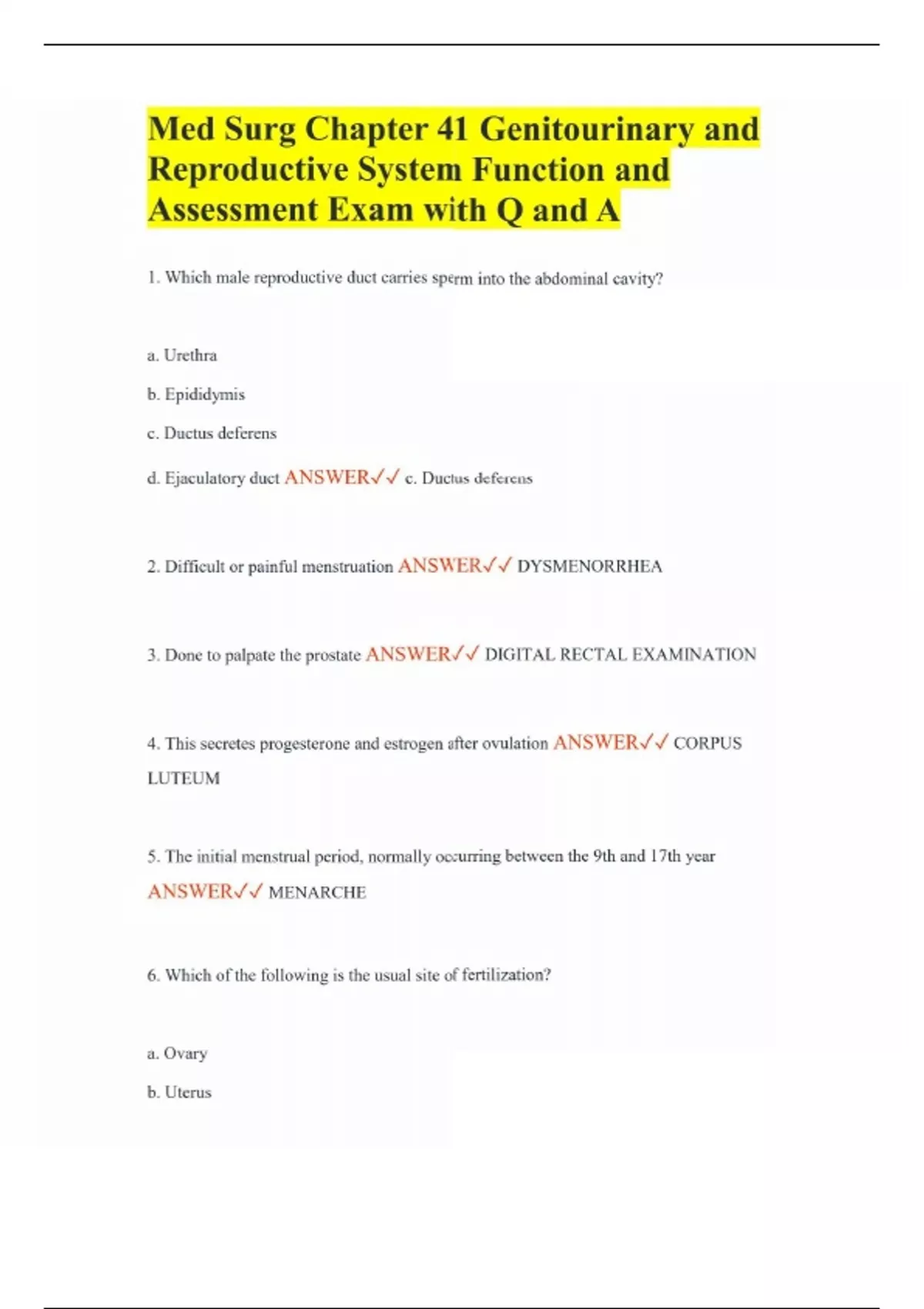 Med Surg Chapter 41 Genitourinary and Reproductive System Function and Assessment Exam with Q and A 1. Which male reproductive duct carries sperm into the abdominal cavity? a. Urethra b. Epididymis c. Ductus deferens d. Ejaculatory duct ANSWER c. Ductus deferens 2. Difficult or painful menstruation ANSWER DYSMENORRHEA 3. Done to palpate the prostate ANSWER DIGITAL RECTAL EXAMINATION 4. This secretes progesterone and estrogen after ovulation ANSWER CORPUS LUTEUM 5. The initial menstrual period, normally occurring between the 9th and 17th year ANSWER MENARCHE 6. Which of the following is the usual site of fertilization? a. Ovary b. Uterus