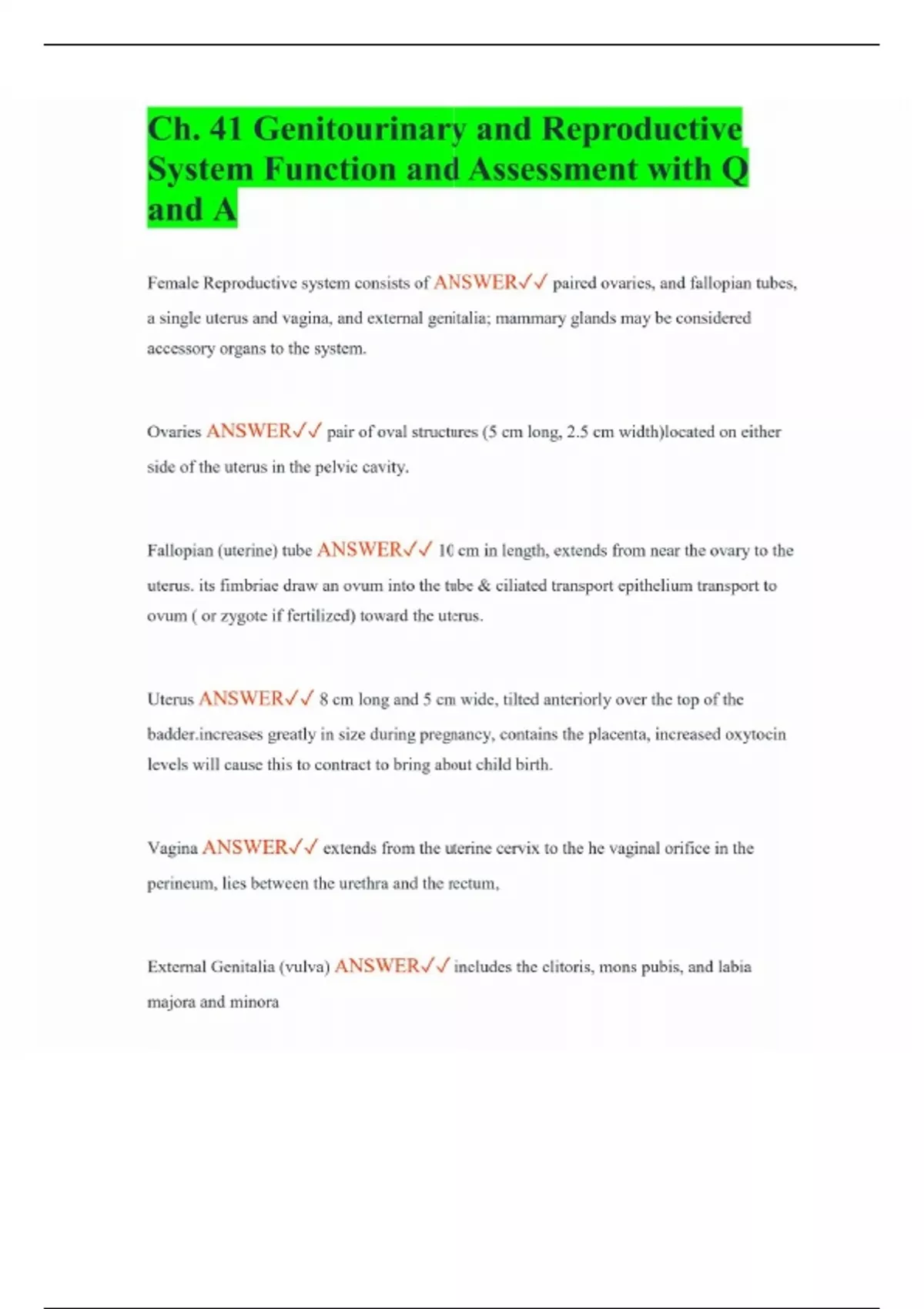 Ch. 41 Genitourinary and Reproductive System Function and Assessment with Q and A Female Reproductive system consists of ANSWER paired ovaries, and fallopian tubes, a single uterus and vagina, and external genitalia; mammary glands may be considered accessory organs to the system. Ovaries ANSWER pair of oval structures (5 cm long, 2.5 cm width)located on either side of the uterus in the pelvic cavity. Fallopian (uterine) tube ANSWER 10 cm in length, extends from near the ovary to the uterus. its fimbriae draw an ovum into the tube & ciliated transport epithelium transport to ovum ( or zygote if fertilized) toward the uterus. Uterus ANSWER 8 cm long and 5 cm wide, tilted anteriorly over the top of the ases greatly in size during pregnancy, contains the placenta, increased oxytocin levels will cause this to contract to bring about child birth. Vagina ANSWER extends from the uterine cervix to the he vaginal orifice in the perineum, lies between the urethra and the rectum, External Genitalia (vulva) ANSWER includes the clitoris, mons pubis, and labia majora and minora Mammary gland ANSWER Enclosed within the breasts and surrounded by adipose