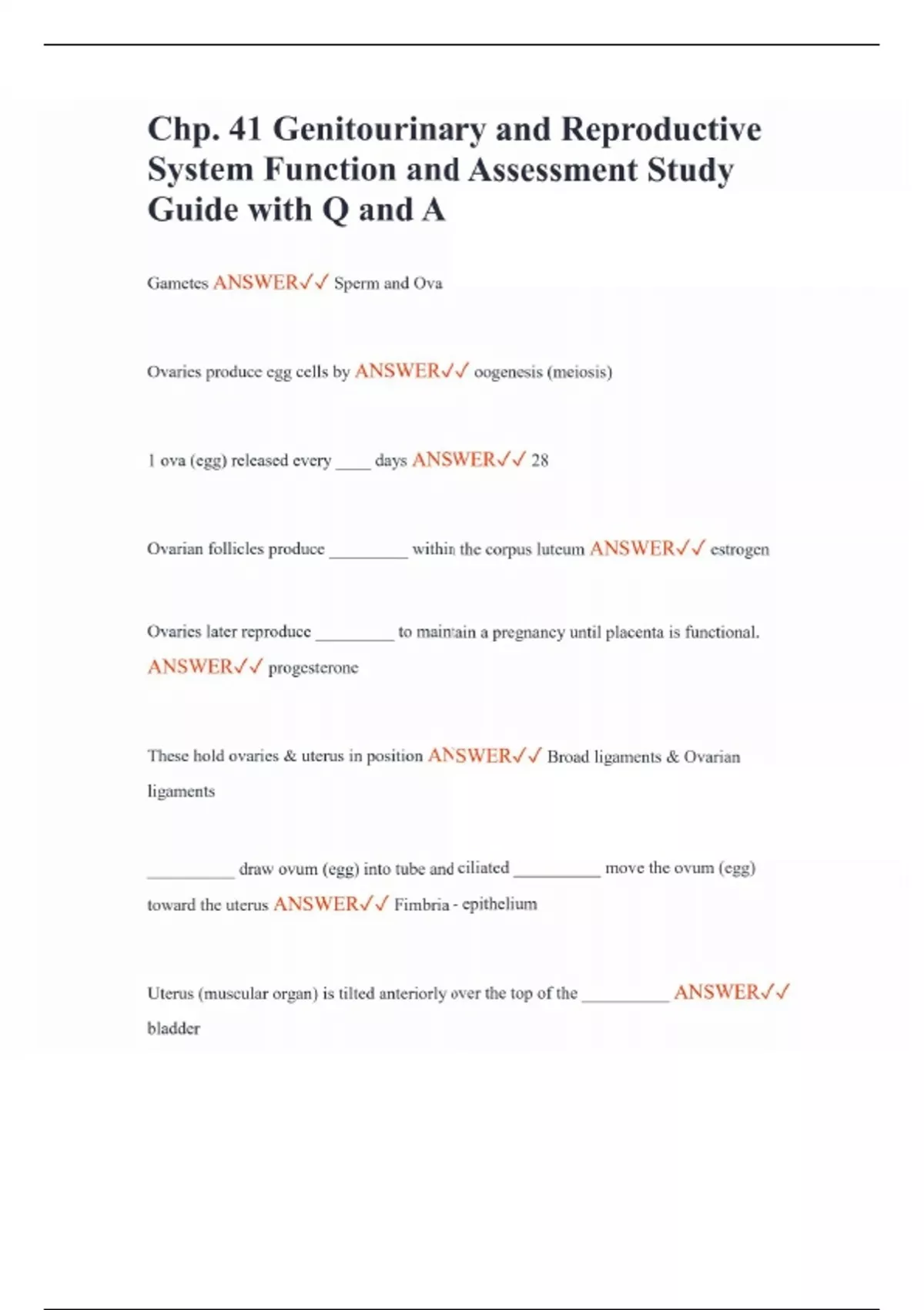 Chp. 41 Genitourinary and Reproductive System Function and Assessment Study Guide with Q and A Gametes ANSWER Sperm and Ova Ovaries produce egg cells by ANSWER oogenesis (meiosis) 1 ova (egg) released every ____ days ANSWER 28 Ovarian follicles produce _________ within the corpus luteum ANSWER estrogen Ovaries later reproduce _________ to maintain a pregnancy until placenta is functional. ANSWER progesterone These hold ovaries & uterus in position ANSWER Broad ligaments & Ovarian ligaments __________ draw ovum (egg) into tube and ciliated __________ move the ovum (egg) toward the uterus ANSWER Fimbria - epithelium Uterus (muscular organ) is tilted anteriorly over the top of the __________ ANSWER bladder