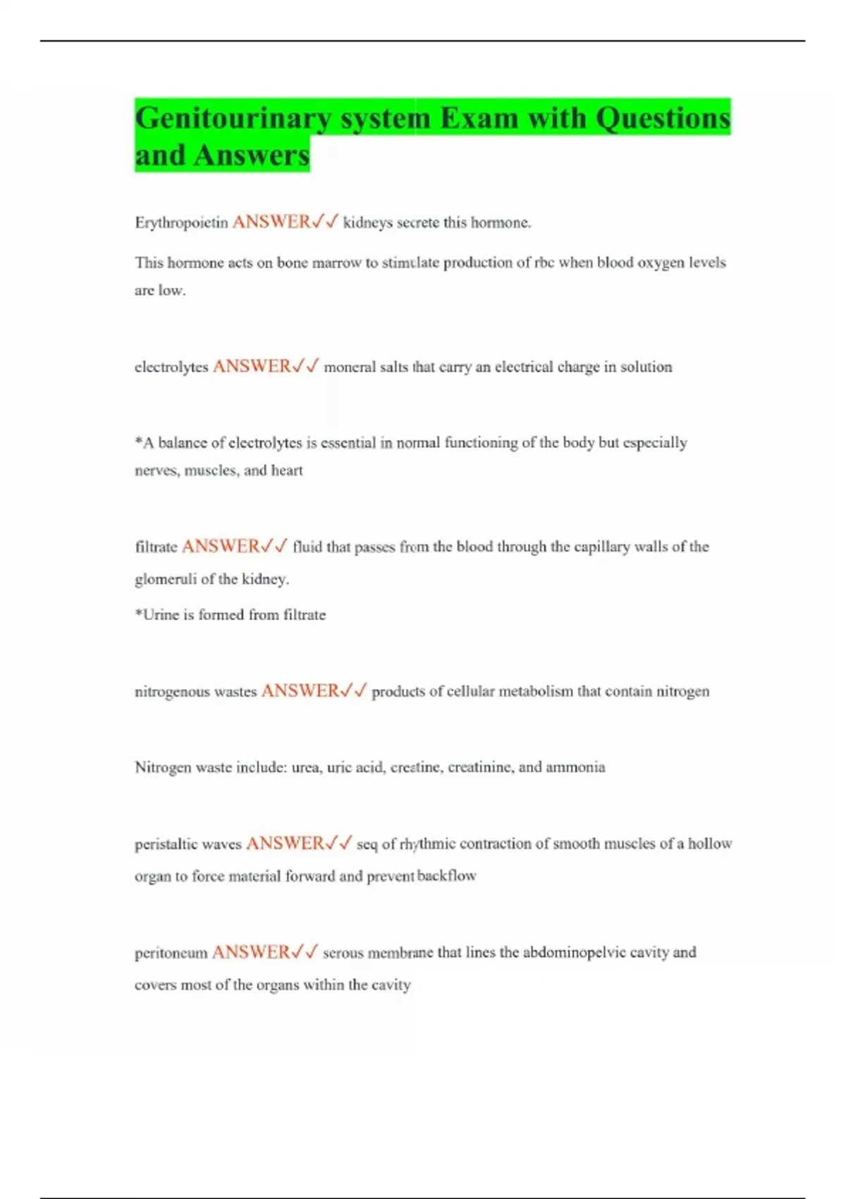 Genitourinary system Exam with Questions and Answers Erythropoietin ANSWER kidneys secrete this hormone. This hormone acts on bone marrow to stimulate production of rbc when blood oxygen levels are low. electrolytes ANSWER moneral salts that carry an electrical charge in solution *A balance of electrolytes is essential in normal functioning of the body but especially nerves, muscles, and heart filtrate ANSWER fluid that passes from the blood through the capillary walls of the glomeruli of the kidney. *Urine is formed from filtrate nitrogenous wastes ANSWER products of cellular metabolism that contain nitrogen Nitrogen waste include: urea, uric acid, creatine, creatinine, and ammonia peristaltic waves ANSWER seq of rhythmic contraction of smooth muscles of a hollow organ to force material forward and prevent backflow peritoneum ANSWER serous membrane that lines the abdominopelvic cavity and covers most of the organs within the cavity plasma ANSWER liq portion of blood, composed primarily of water (90%),