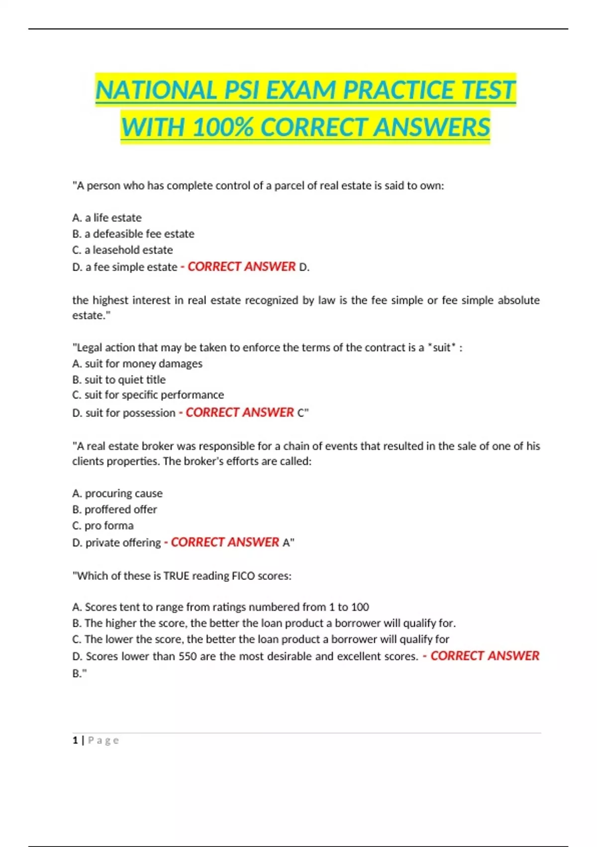 NATIONAL PSI EXAM PRACTICE TEST WITH 100% CORRECT ANSWERS "A person who has complete control of a parcel of real estate is said to own: A. a life estate B. a defeasible fee estate C. a leasehold estate D. a fee simple estate - CORRECT ANSWER D. the highest interest in real estate recognized by law is the fee simple or fee simple absolute estate." "Legal action that may be taken to enforce the terms of the contract is a *suit* : A. suit for money damages B. suit to quiet title C. suit for specific performance D. suit for possession - CORRECT ANSWER C" "A real estate broker was responsible for a chain of events that resulted in the sale of one of his clients properties. The broker's efforts are called: A. procuring cause B. proffered offer C. pro forma D. private offering - CORRECT ANSWER A" "Which of these is TRUE reading FICO scores: A. Scores tent to range from ratings numbered from 1 to 100 B. The higher the score, the better the loan product a borrower will qualify for. C. The lower the score, the better the loan product a borrower will qualify for D. Scores lower than 550 are the most desirable and excellent scores. - CORRECT ANSWER B." "A brokerage represents the owner in the sale of the owner's property. Which of these events will terminate that agency relationship: A. the broker discovers that an adequate commission cannot be made due to the low market value of the property B. a fire destroys the property C. the broker engages other brokers to help sell the property D. the owner abandons the property. - CORRECT ANSWER B" “Real Estate law governing advertising applies to all of these EXCEPT: A. In house notes for showing B. Multiple listing service (MLS) C. communications with consumers D. Social Media - CORRECT ANSWER A. In-house notes for showing are not seen by consumers an so do not have to follow state or federal laws." "General real estate property taxes levied for the operation of the government are called: A. special taxes B. ad valorem taxes C. improvement taxes D. special assessment taxes - CORRECT ANSWER B." "A couple accompanies a property inspector during an inspection of a house on which they have a contract. The inspector points to a six-inch crack at the corner of a dining room window. The crack is an example of : A. A structural defect B. A patent Defect C. a latent defect D. an environmental defect - CORRECT ANSWER B. A patent defect is easily visible when inspecting a property. (another) term for material)" "An eligible veteran made an offer of $225,000 to purchase a home contingent upon obtaining a no-down payment U.S department of Veterans Affairs (VA) guaranteed loan. Three weeks after the offer was accepted, the VA issued a certificate of reasonable value (CRV) for the $222,000 for the property. In this case, the veteran may: A. withdraw from the sale with a three-point penalty B. withdraw from the sale on payment of a commission to the seller's broker C. purchase the property by making a $3,000 cash payment D. seek secondary funding for the $3,0000 - CORRECT ANSWER C. When the purchase price of a property is greater than the VA-issued (CRV), the veteran may pay the difference in cash to purchase the property because secondary financing is somewhat restricted under VA regulations." "Under current Regulations, a U.S. department of Veteran Affairs (VA) loan is assumable if: A. The VA approves both the buyer and the assumption agreement B. the veteran agrees not to request a releases of liability for repayment C. the VA approves the buyer only D. the VA approves the assumption of the agreement only - CORRECT ANSWER A. for VA loans made after March 1, 1988 the VA must approve both the buyer and the assumption agreement before the loan may be assumed." "If there is a discrepancy between a residential lot size quoted in a listing contract and the actual lot size, the actual lot size that will prevail in a sales transaction will be found in : A. the MLS B. the survey C. the listing contract D. the deed - CORRECT ANSWER B." "The buyers secured a loan at 75% (LTV) ration. The interest rate was 7.125%, and the term was for 30 Years. The first month's interest payment was $477.82. What was the appraised value of the property? A. $103.700 B. $80,475 C. $107,300 D. 79,239 - CORRECT ANSWER C. $477.82x12=$5,733.84 annual interest $5,733.84/7.125%=$80,475 $80,475/75%=$107,300" "Last month's loan payment included $412.50 interest on a $60,000 loan balance. What is the annual rate of interest? A. 7.75% B. 8.25% C, 8.5% D. 7.5% - CORRECT ANSWER B. $412.50 x 12 = $4,950(annual interest amount) $4,950 / $60,000 (loan balance) = 8.25% (0 0825) interest" "The component of an adjustable rate mortgage (ARM) that limits the percentage that the interest rate may increase over a specific time period. usually a year is: A. the margin B. the life-of-the loan rate cap C. the payment cap D. the rate cap - CORRECT ANSWER D. the rate cap limits the amount an ARM's interest rate may change over a specific period of time, usually a year." "In MOST market ares, rents are determined by: A. the local apartment owner's association B. department of housing (HUD) C. a tenants union D. supply and demand factors - CORRECT ANSWER D. The amount of properties and vacancy determine rental values" "A couple purchased a home for cash over 25 years ago. Today the receive monthly checks from a lender that supplement their retirement income. The couple MOST likely have: A. a home equity loan B. a reverse mortgage C. an interest -only loan D. an adjustable rate mortgage - CORRECT ANSWER B." "Poetenially resonsibke parties (PRP'S) are LEAST likeley to be: A. present owners B. hazard disposal operators C. past owners D. real estate licensees - CORRECT ANSWER D." "A contract that conveys the right to possess the real property of another but does not convey title is : A. a bill of sale B. a lease C. a dedication D. a quitclaim deed - CORRECT ANSWER B" "The rent collected on a 9 Unit building is as follows: Three a
