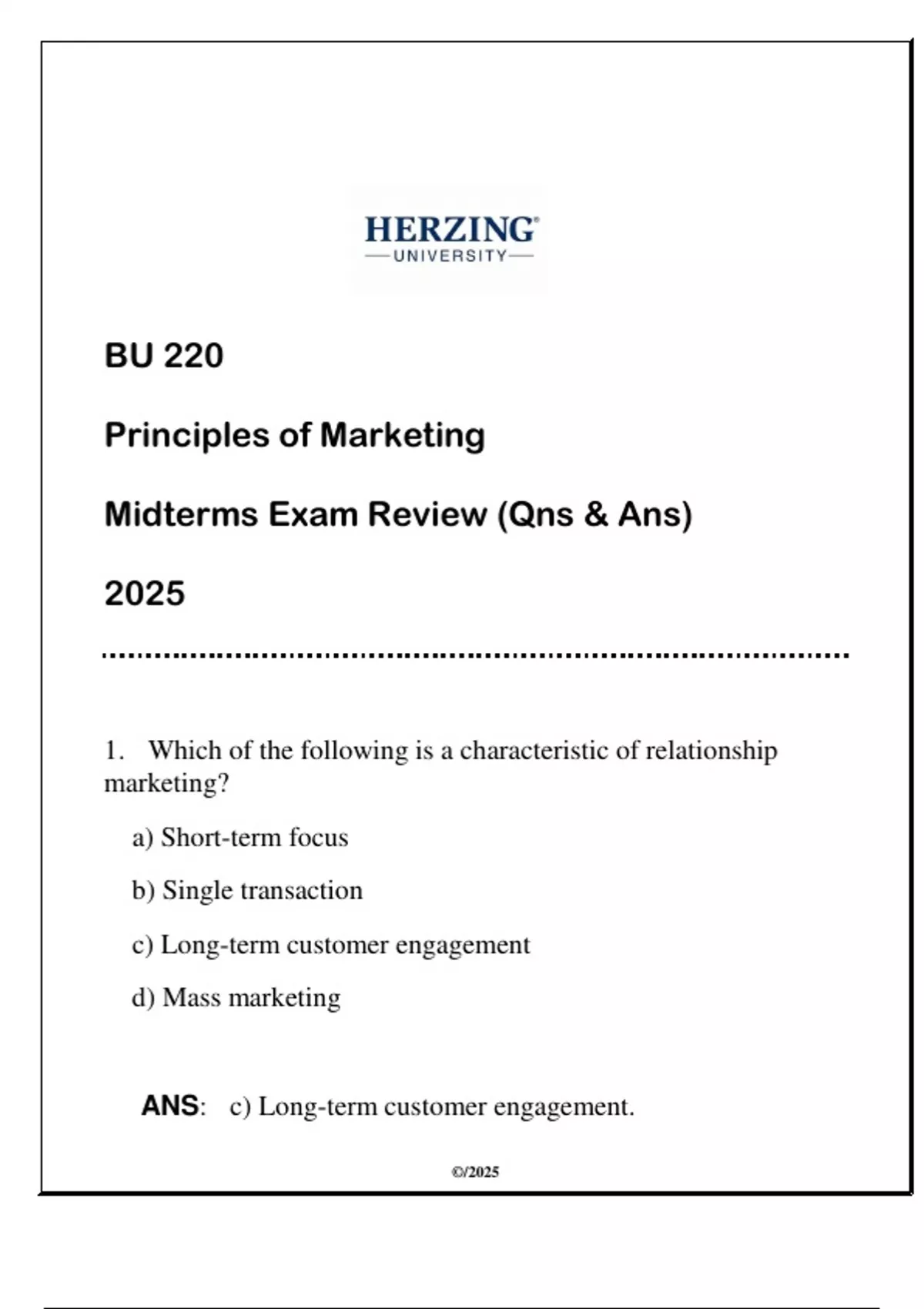 BU 220 Principles of Marketing (HU) Midterms Qns & Ans 2025