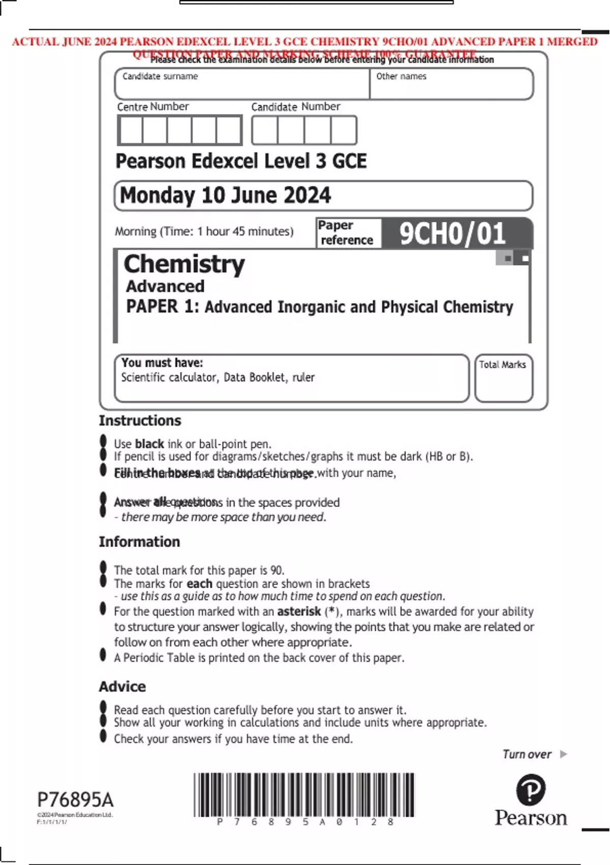 ACTUAL JUNE 2024 PEARSON EDEXCEL LEVEL 3 GCE CHEMISTRY 9CHO/01 ADVANCED PAPER 1 MERGED QUESTION PAPER AND MARKING SCHEME 100% GUARANTEE