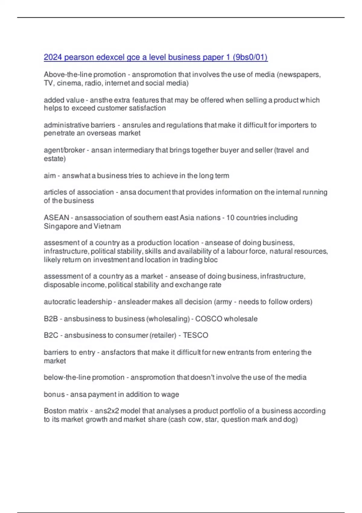 2024 pearson edexcel gce a level business paper 1 (9bs0/01)