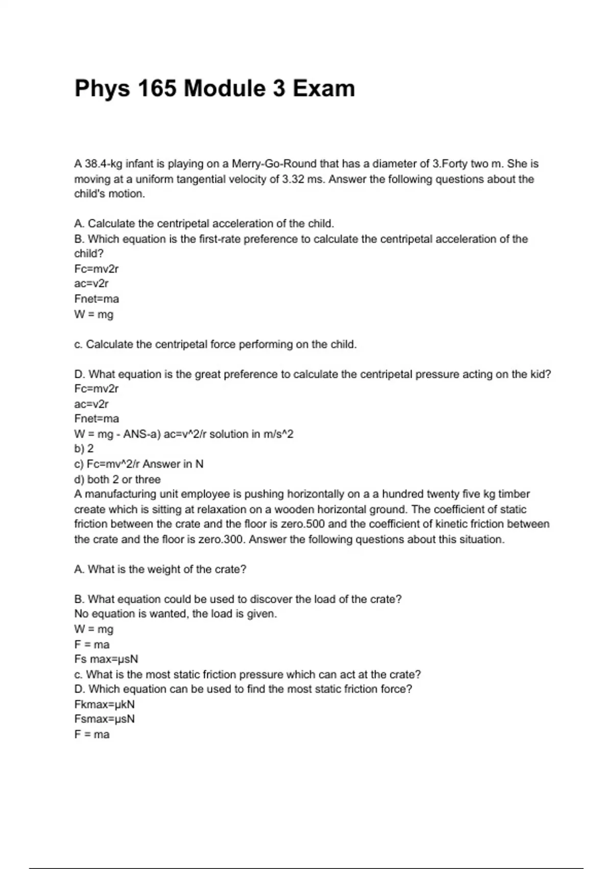W = mg - ANS-a) ac=v^2/r solution in m/s^2