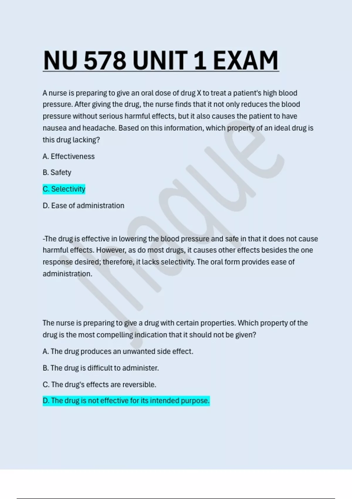 NU 578 / NU578 UNIT 1 EXAM. DRUGS. QUESTIONS WITH 100% CORRECT ANSWERS.