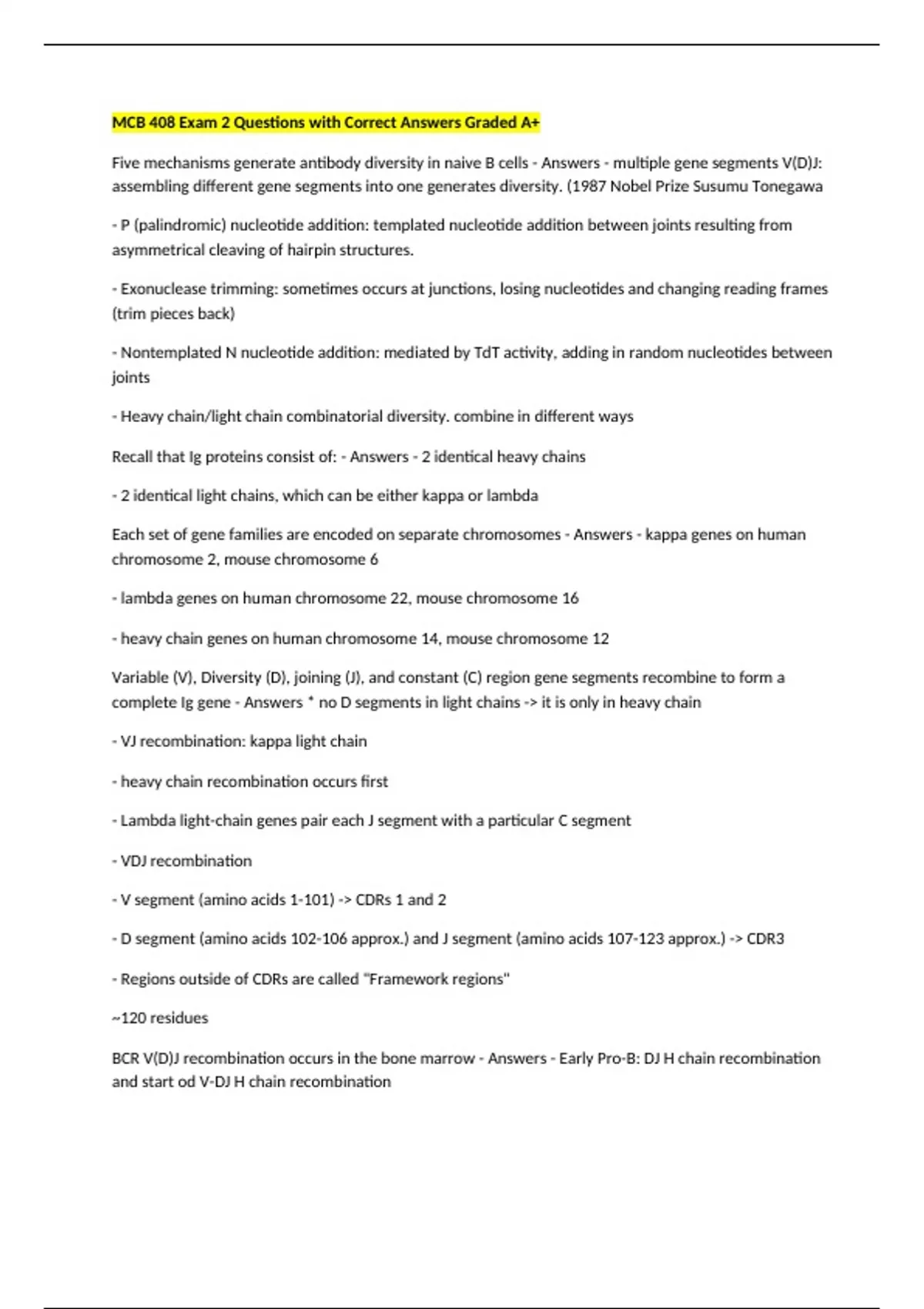 Five mechanisms generate antibody diversity in naive B cells - Answers - multiple gene segments V(D)J: