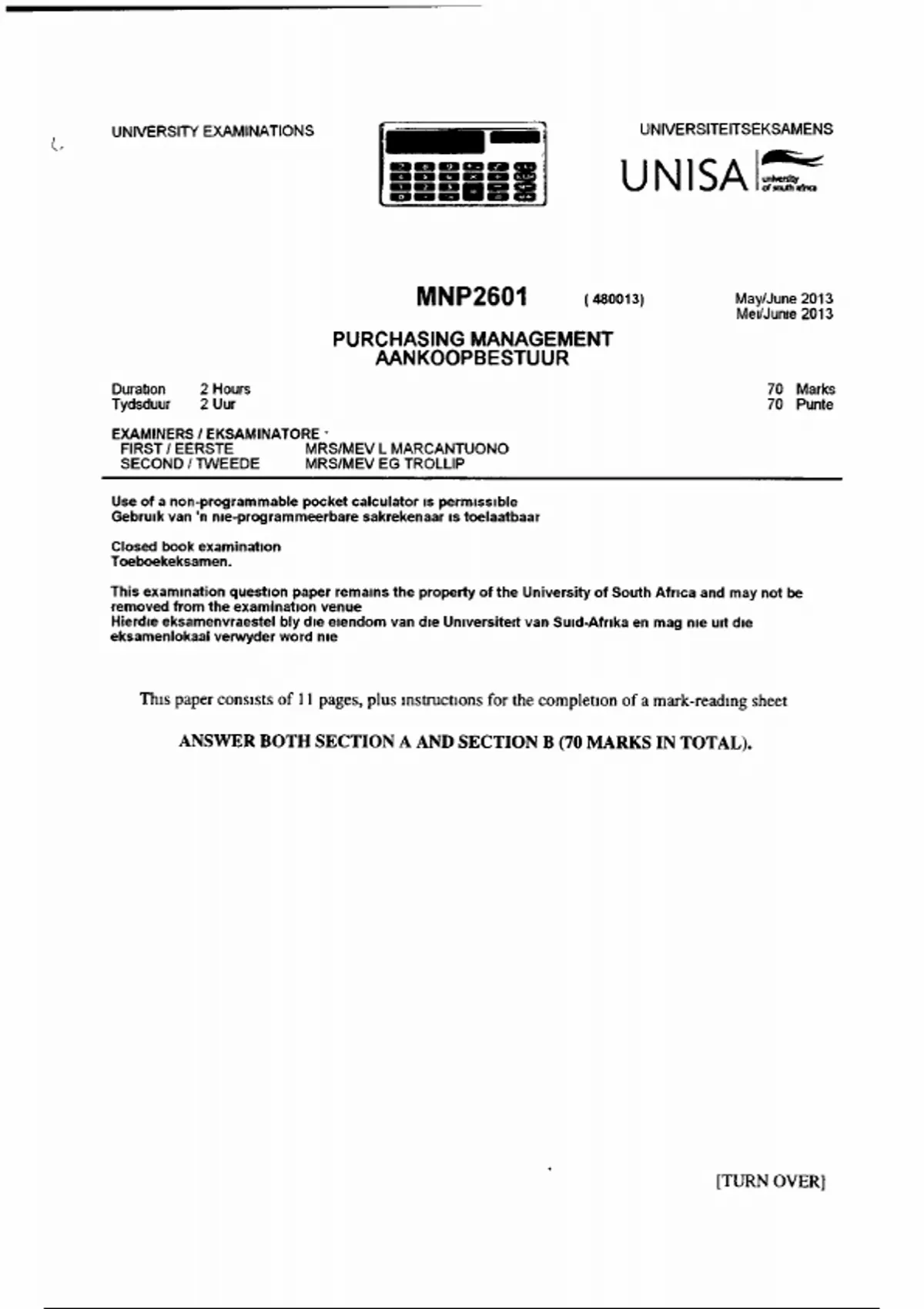 This document is an exam paper from the University of South Africa (UNISA) for the course MNP2601, titled "Purchasing Management." It's a closed-book examination consisting of two sections, A and B, and students are required to answer both. Section A contains multiple-choice questions, while Section B requires more detailed answers on topics like centralized organizational structures, revenue pricing models, and supply management's role. The exam aims to evaluate students' understanding of purchasing and supply chain management principles and their application.