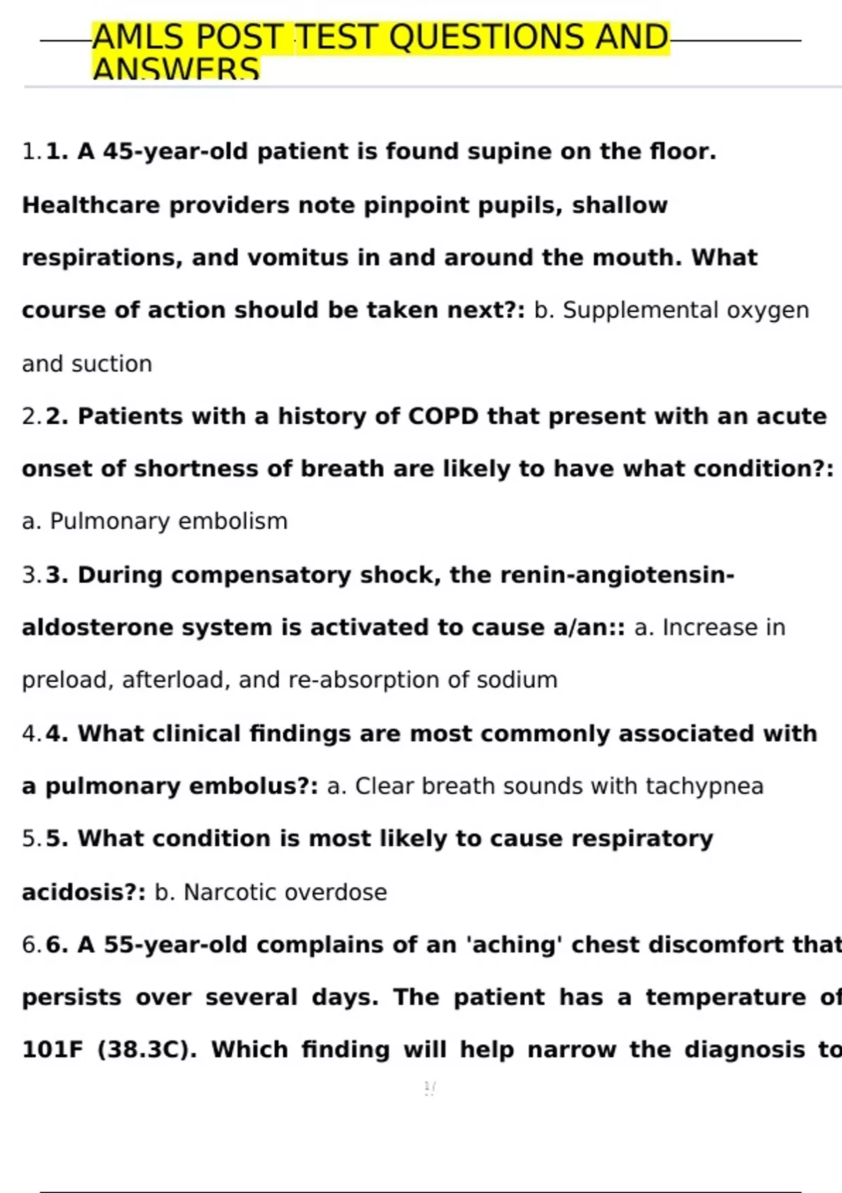 AMLS POST TEST QUESTIONS AND ANSWERS 1. 1. A 45-year-old patient is found supine on the floor. Healthcare providers note pinpoint pupils, shallow respirations, and vomitus in and around the mouth. What course of action should be taken next?: b. Supplemental oxygen and suction 2. 2. Patients with a history of COPD that present with an acute onset of shortness of breath are likely to have what condition?: a. Pulmonary embolism 3. 3. During compensatory shock, the renin-angiotensin-aldosterone system is activated to cause a/an:: a. Increase in preload, afterload, and re-absorption of sodium
