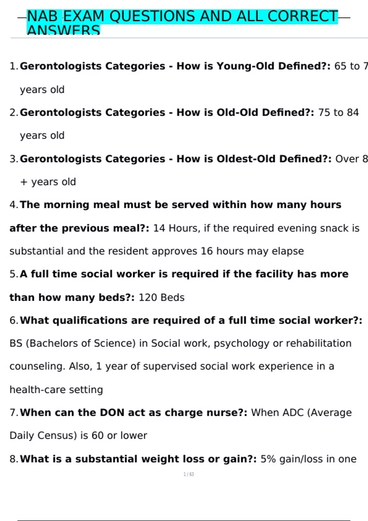 NAB EXAM QUESTIONS AND ALL CORRECT ANSWERS 1. Gerontologists Categories - How is Young-Old Defined?: 65 to 74 years old 2. Gerontologists Categories - How is Old-Old Defined?: 75 to 84 years old 3. Gerontologists Categories - How is Oldest-Old Defined?: Over 85 + years old 4. The morning meal must be served within how many hours after the previous meal?: 14 Hours, if the required evening snack is substantial and the resident approves 16 hours may elapse