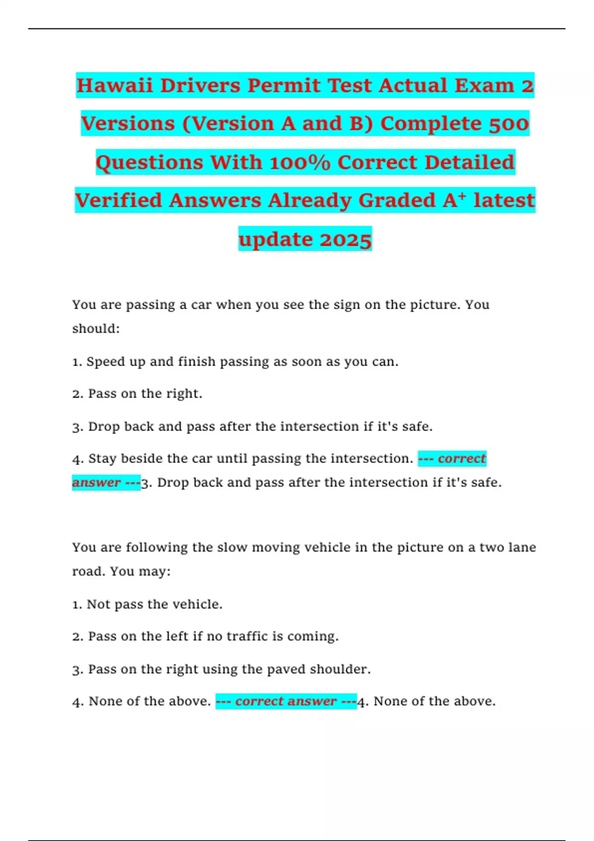 Hawaii Drivers Permit Test Actual Exam 2 Versions (Version A and B) Complete 500 Questions With 100% Correct Detailed Verified Answers Already Graded A+ latest update 2025 You are passing a car when you see the sign on the picture. You should: 1. Speed up and finish passing as soon as you can. 2. Pass on the right. 3. Drop back and pass after the intersection if it's safe. 4. Stay beside the car until passing the intersection. --- correct answer ---3. Drop back and pass after the intersection if it's safe. You are following the slow moving vehicle in the picture on a two lane road. You may: 1. Not pass the vehicle. 2. Pass on the left if no traffic is coming. 3. Pass on the right using the paved shoulder. 4. None of the above. --- correct answer ---4. None of the above.