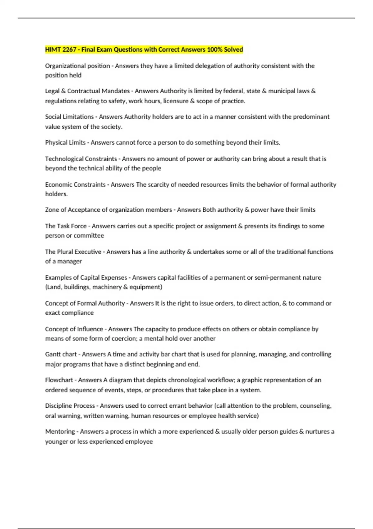 HIMT 2267 - Final Exam Questions with Correct Answers 100% Solved Organizational position - Answers they have a limited delegation of authority consistent with the position held Legal & Contractual Mandates - Answers Authority is limited by federal, state & municipal laws & regulations relating to safety, work hours, licensure & scope of practice. Social Limitations - Answers Authority holders are to act in a manner consistent with the predominant value system of the society. Physical Limits - Answers cannot force a person to do something beyond their limits. Technological Constraints - Answers no amount of power or authority can bring about a result that is beyond the technical ability of the people Economic Constraints - Answers The scarcity of needed resources limits the behavior of formal authority holders. Zone of Acceptance of organization members - Answers Both authority & power have their limits The Task Force - Answers carries out a specific project or assignment & presents its findings to some person or committee The Plural Executive - Answers has a line authority & undertakes some or all of the traditional functions of a manager Examples of Capital Expenses - Answers capital facilities of a permanent or semi-permanent nature (Land, buildings, machinery & equipment) Concept of Formal Authority - Answers It is the right to issue orders, to direct action, & to command or exact compliance Concept of Influence - Answers The capacity to produce effects on others or obtain compliance by means of some form of coercion; a mental hold over another Gantt chart - Answers A time and activity bar chart that is used for planning, managing, and controlling major programs that have a distinct beginning and end. Flowchart - Answers A diagram that depicts chronological workflow; a graphic representation of an ordered sequence of events, steps, or procedures that take place in a system. Discipline Process - Answers used to correct errant behavior (call attention to the problem, counseling, oral warning, written warning, human resources or employee health service) Mentoring - Answers a process in which a more experienced & usually older person guides & nurtures a younger or less experienced employee network - Answers a group of individuals who communicate through formal & informal channels & willingly promote one another for mutual benefit peer pals - Answers boost one another's careers by sharing informatio