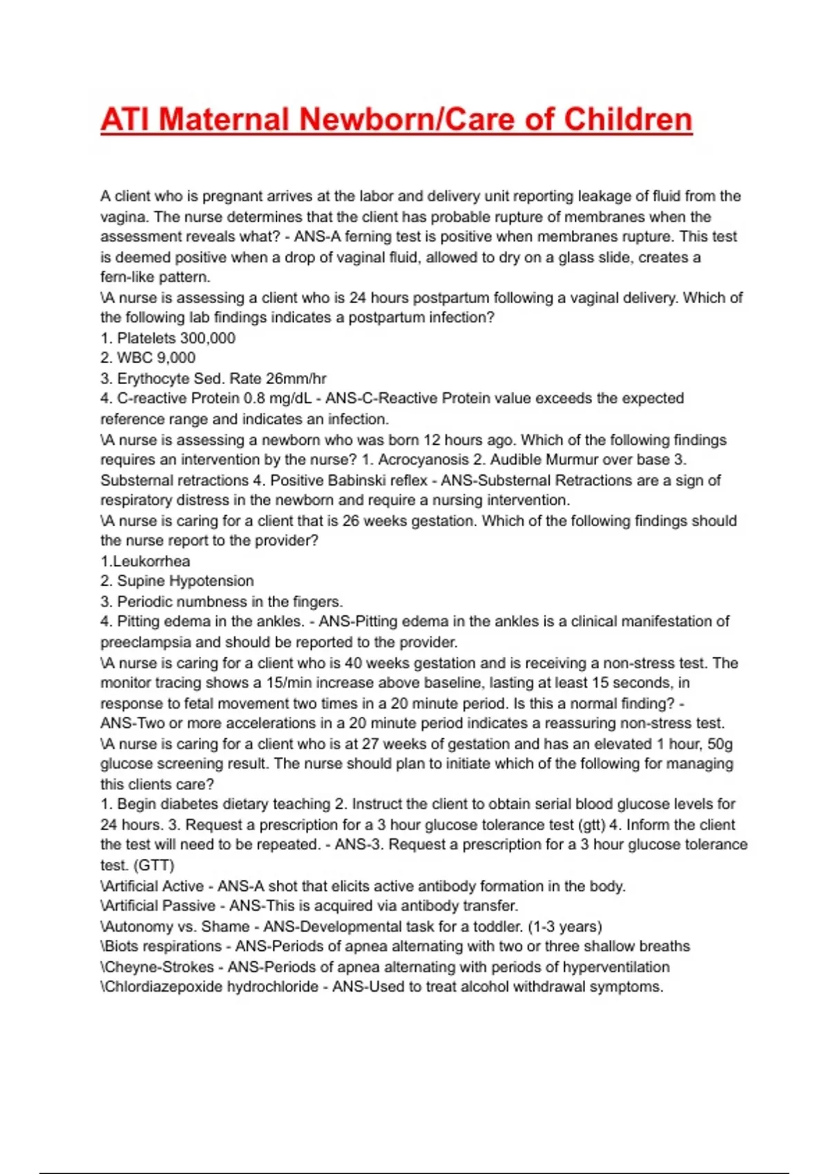 ATI Maternal Newborn/Care of Children