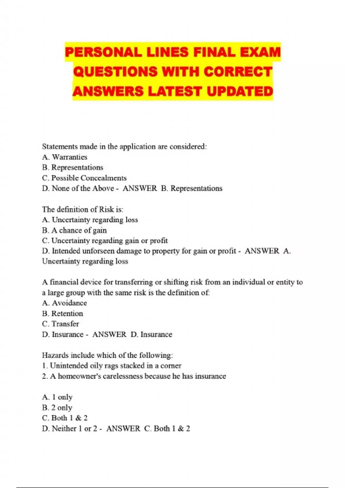 PERSONAL LINES FINAL EXAM QUESTIONS WITH CORRECT ANSWERS LATEST UPDATED