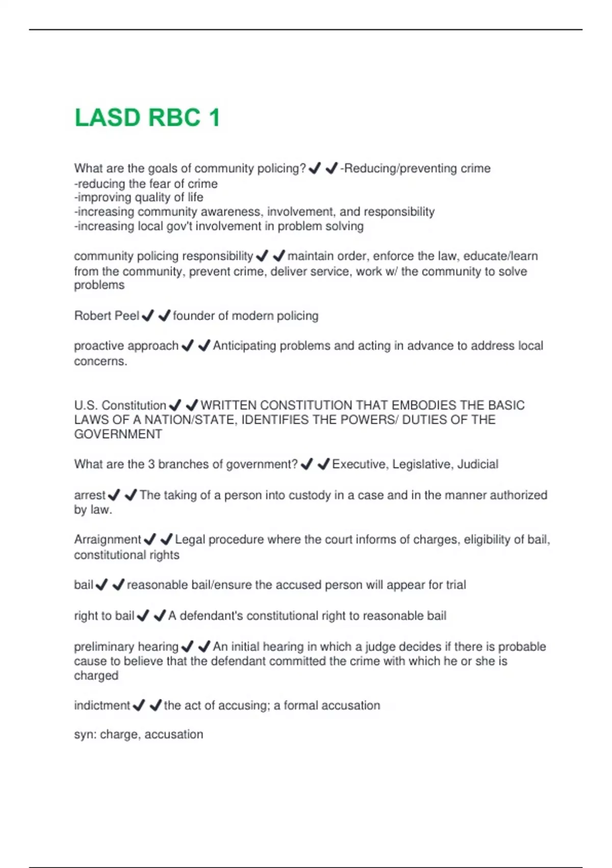 What are the goals of community policing?️️-Reducing/preventing crime -reducing the fear of crime -improving quality of life -increasing community awareness, involvement, and responsibility -increasing local gov't involvement in problem solving community policing responsibility️️maintain order, enforce the law, educate/learn from the community, prevent crime, deliver service, work w/ the community to solve problems Robert Peel️️founder of modern policing proactive approach️️Anticipating problems and acting in advance to address local concerns. U.S. Constitution️️WRITTEN CONSTITUTION THAT EMBODIES THE BASIC LAWS OF A NATION/STATE, IDENTIFIES THE POWERS/ DUTIES OF THE GOVERNMENT What are the 3 branches of government?️️Executive, Legislative, Judicial