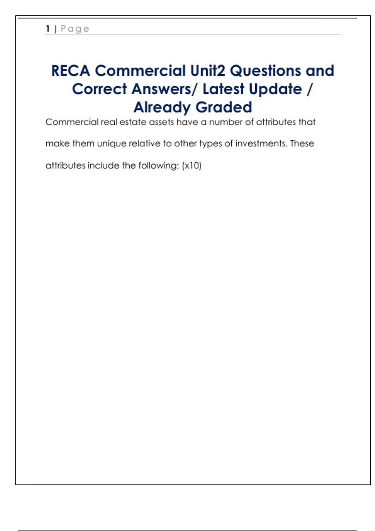 Commercial real estate assets have a number of attributes that make them unique relative to other types of investments. These attributes include the following: (x10) 2 | P a g e Ans: 1. They involve land 2.Transaction time frames are long 3. Transaction costs are high 4. they are expensive 5. They are long lasting 6. Highly regulated 7. have a long production cycle 8. are management intensive 9. are heterogeneous 10. Involve measuring return on investment 1. Long-lasting, Durable Goods 2. Expensive, High-valued (left for well capitalized investors) 3 | P a g e 3. Transaction Costs: Due diligence and commissions alone comprise about three to five percent of transaction costs. 4. Transaction Time Frame 5. Land 6. Heterogeneous: every parcel of land is unique so every commercial real estate asset is unique. However, improvements are rarely identical as unique site characteristics, land use regulations, and the market often require different solutions from developers. 7. Return Measures 8. Management Intensive 9. Long Production Cycle: it takes time to develop and construct new commercial real estate assets to meet the needs of the expanding population. This results in the real estate supply being relatively slow to respond to changes in demand (i.e. inelastic supply